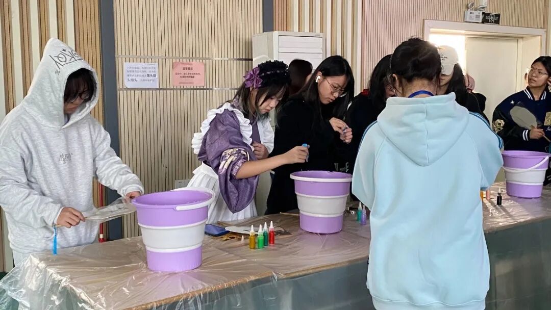 素面竹扇是待填色的留白,天然漆料是时光沉淀的色彩——当这些带着传统质感的材料铺展在地面,同学们便在亲手晕染中开启了“让古扇焕新”的创意体验。
