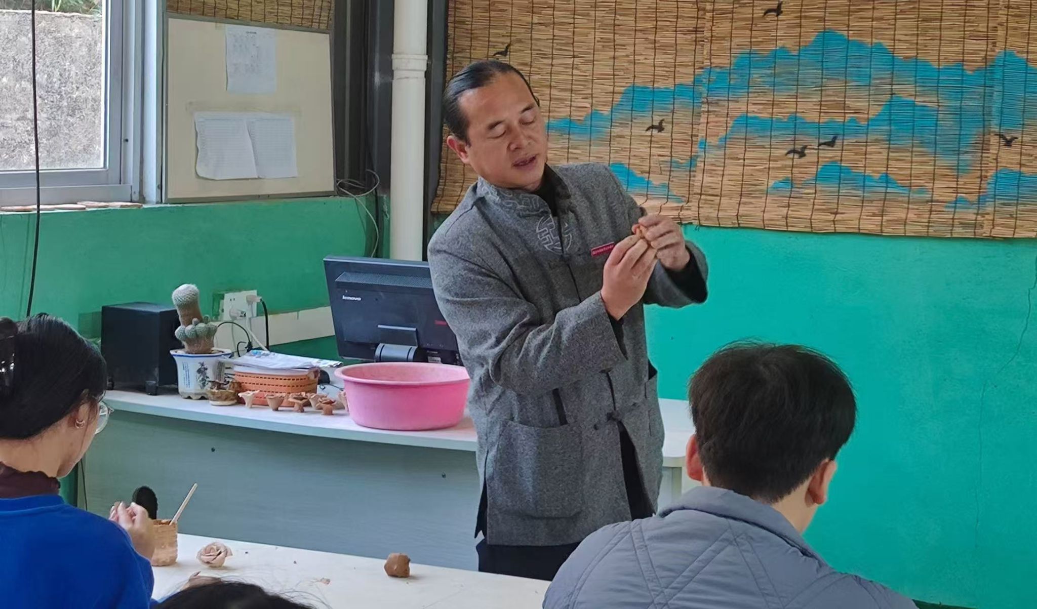 同学们围在拉坯机旁,从一开始的手忙脚乱,到慢慢找到节奏。有人捏出了小巧的茶杯,有人尝试了别致的茶盏,哪怕是歪歪扭扭的“半成品”,也藏着独属于自己的心意。沾满陶土的双手,是与非遗最亲密的接触;阳光下晾晒的陶坯,是青春与传统碰撞的印记。