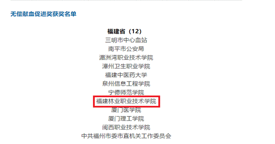 日前,福建林业职业技术学院荣获2018-2019年度全国无偿献血促进奖,由国家卫生健康委员会与中国红十字会总会、中央军委后勤保障部卫生局联合表彰,已在国家卫生健康委员会网站公示。全国共表彰2018-2019年度无偿献血促进奖单位449个,其中福建省12个,福建林业职业技术学院位列其中。