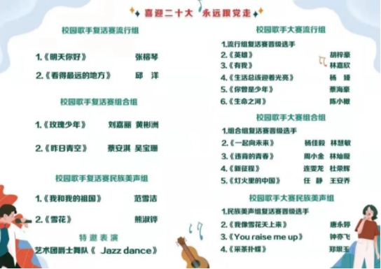 喜迎二十大,永远跟党走。为丰富校园文化生活,营造高雅育人氛围,提升大学生艺术修养水平,反映当代青年学子富有生机活力的精神面貌。2022年5月31日,院团委在江南校区体育馆礼堂举办“喜迎二十大,永远跟党走”第24届校园歌手大赛总决赛。院党委副书记严绍裕老师、团委书记陈友益老师莅临决赛现场观看比赛。经过初赛、复赛和复活赛一路过关斩将的15名选手共同决战舞台,为在场观众带来一场视听盛宴。