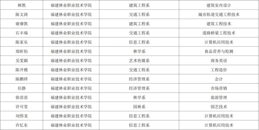 福建林业职业技术学院获奖名单