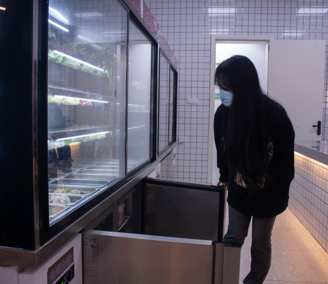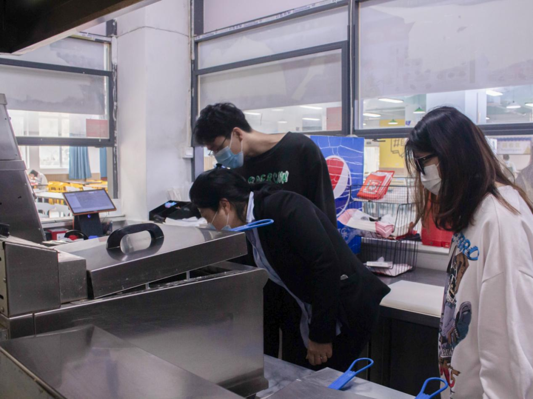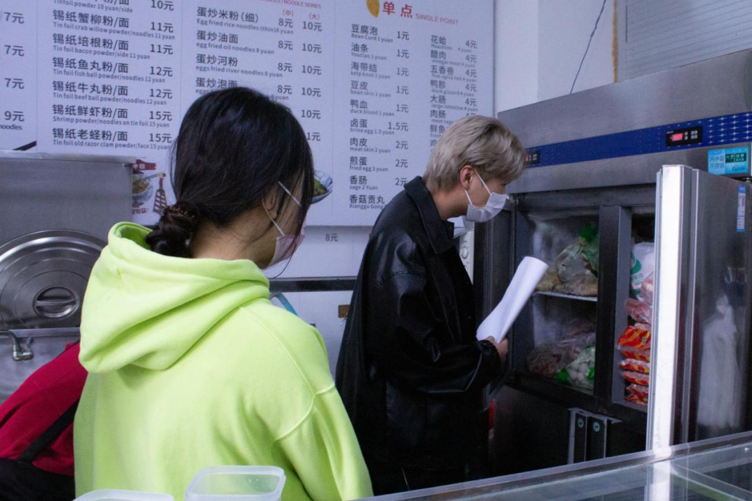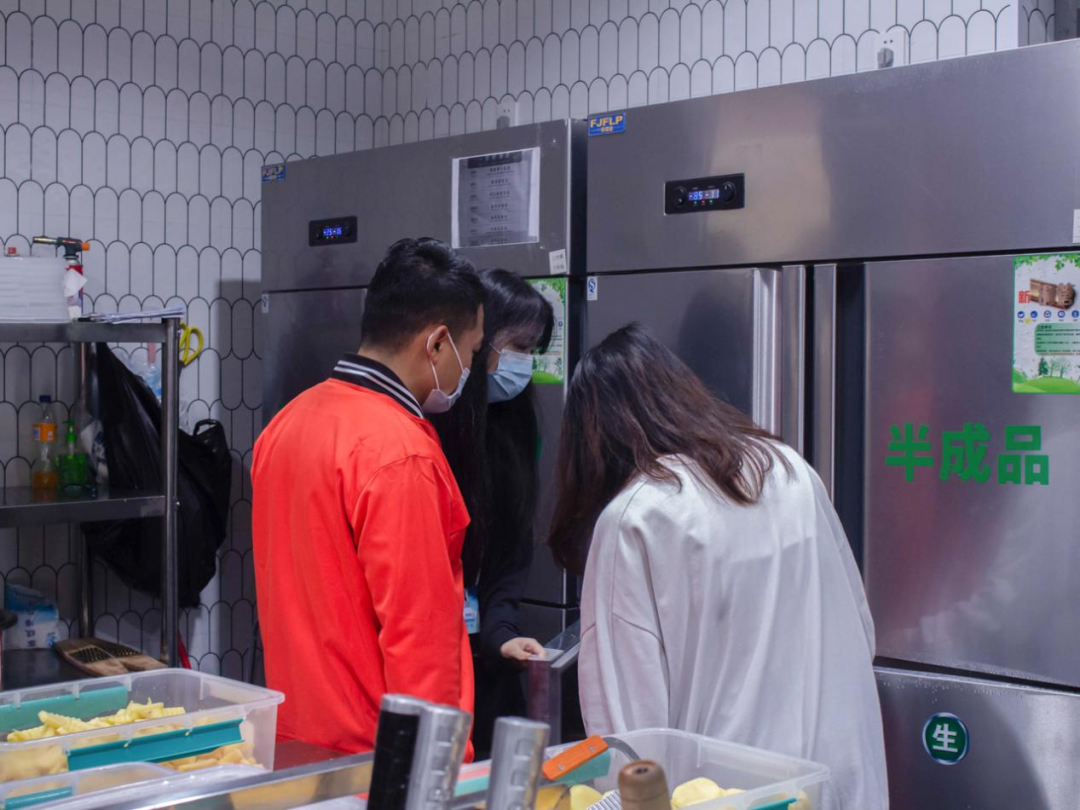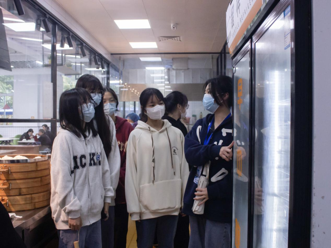 食堂的后厨情况,冰箱的卫生是重中之重,卫生达标的冰箱才能放进清洗完密封完整的食材。工作人员介绍完后,学生代表检查了冰箱的卫生情况,食材是否密封完整等。