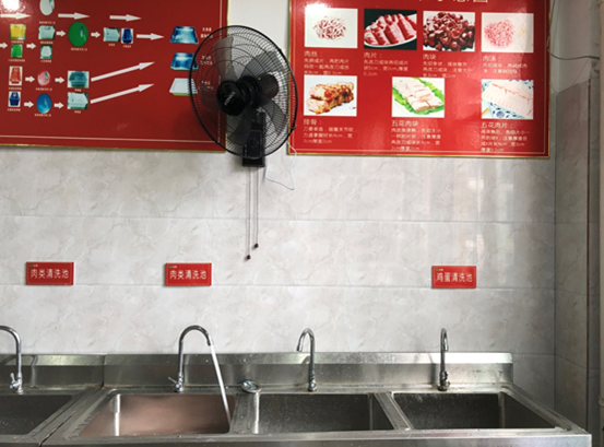 食堂操作间里的所有食物都采取了色标化管理,以区分处理不同的肉食和海鲜。操作间内有明确的区分:蔬菜区、肉类区等等,确保生熟分离,分类清晰,有效减少食品处理过程中的交叉污染,充分利用“明厨亮灶”,以确保食品的卫生安全。