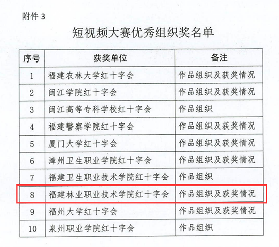 近日,由福建省红十字会主办的第二届闽台红十字大学生短视频大赛落下帷幕。本次大赛旨在传播“人道、博爱、奉献”的红十字精神,展现当代红十字青少年蓬勃向上精神风貌。自活动开展以来,我院团委高度重视,科学谋划,院红十字会精心组织,围绕着“闽台相守望,人道展风采”主题,通过线上线下多维度宣传及组织,选送了一批优秀作品参赛,其中选送作品《光》、《五号楼行动》获优秀作品奖,我院红十字会蝉联闽台红十字大学生短视频大赛“优秀组织奖”。