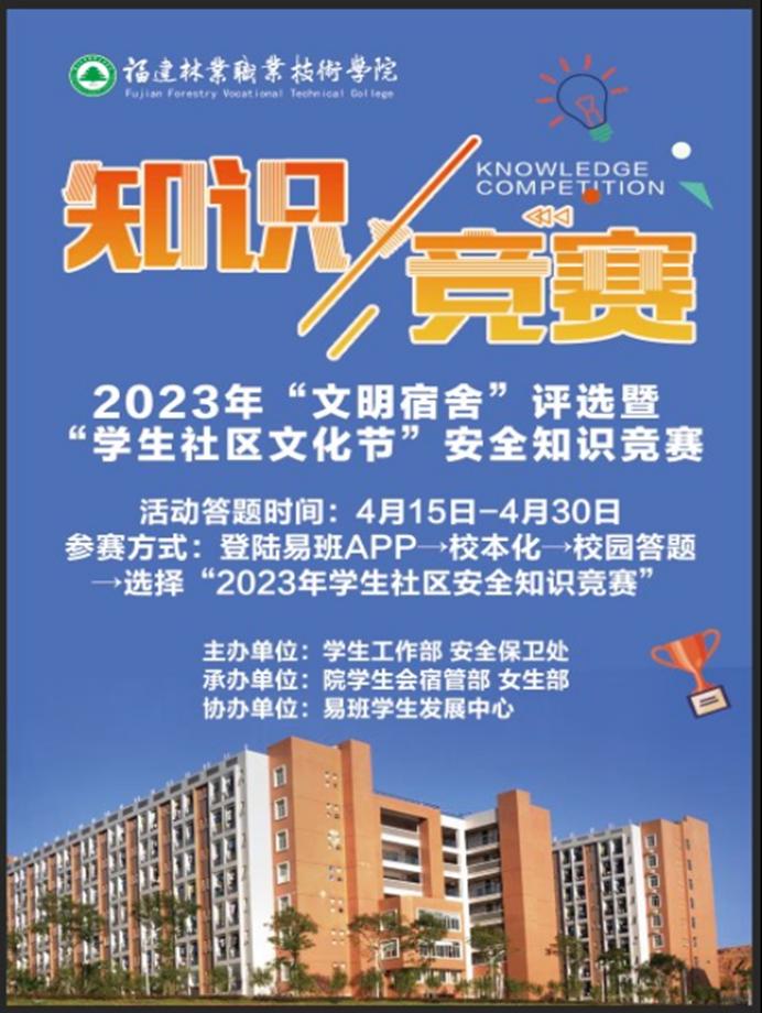 为了深入学习党的二十大精神,礼赞建校七十载,树牢总体国家安全观,感悟新时代国家安全成就,营造良好氛围,提高学生安全意识, 普及宿舍安全知识。防范宿舍安全事故的发生,营造一个安全、文明、舒适的宿舍环境。院宿舍管理委员会于4月15日至30日开展“学生社区文化节”安全知识竞赛答题活动,以赛促学,以学促行,让同学们在学习中掌握本领。