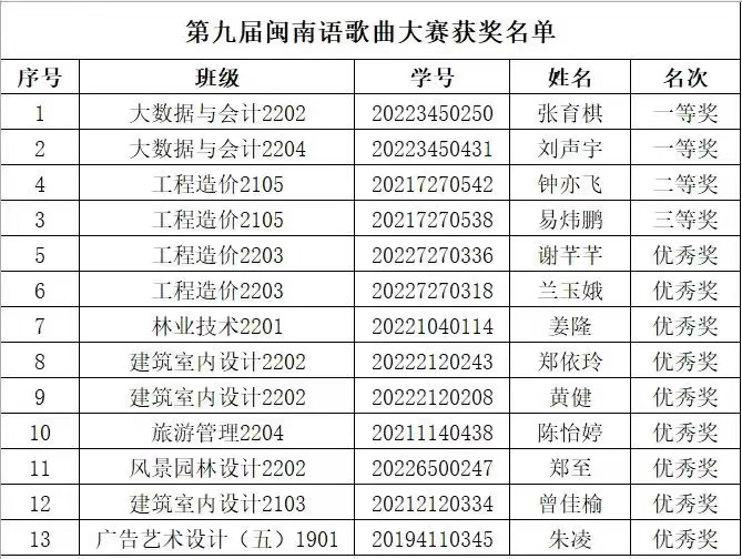▲“风韵”第九届闽南歌曲大赛获奖名单