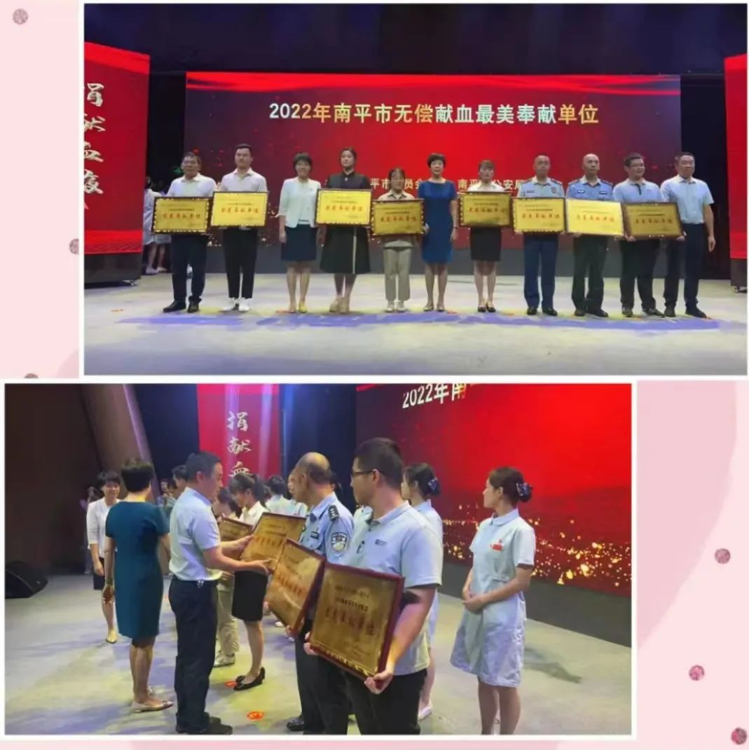 为深入学习宣传贯彻党的二十大精神,扎实推进“争优 争先 争效”行动,弘扬献血救人的无私奉献精神,践行社会主义核心价值观,助力文明城市创建。6月13日上午,在第二十个“世界献血者日”来临之际,由南平市卫生健康委员会、中共南平市委文明办、南平市红十字会、共青团南平市委员会主办,南平市中心血站、南平市广播电视台承办的南平市第二十个“世界献血者日”无偿献血宣传暨2020-2021年度全国无偿献血奉献奖颁奖典礼在南平市大剧院举行。我院荣获“2022年度南平市无偿献血最美奉献单位”!