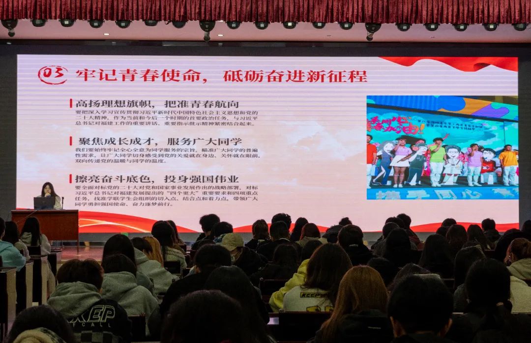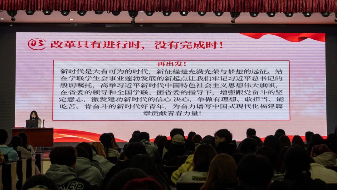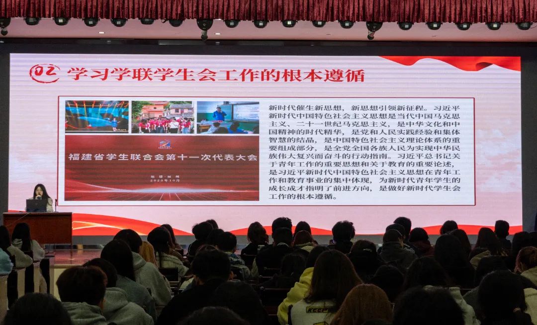 为进一步深入学习领会省学联第十一次代表大会精神,切实加强我院学生会内涵建设,不断提升服务全校学生能力。2023年11月16日下午,组织我院学生会在江南校区礼堂开展省学联十一大会议精神主题学习会,会议由院主席团成员丁慧琳主持,院系学生会骨干近200人参加此次学习活动。