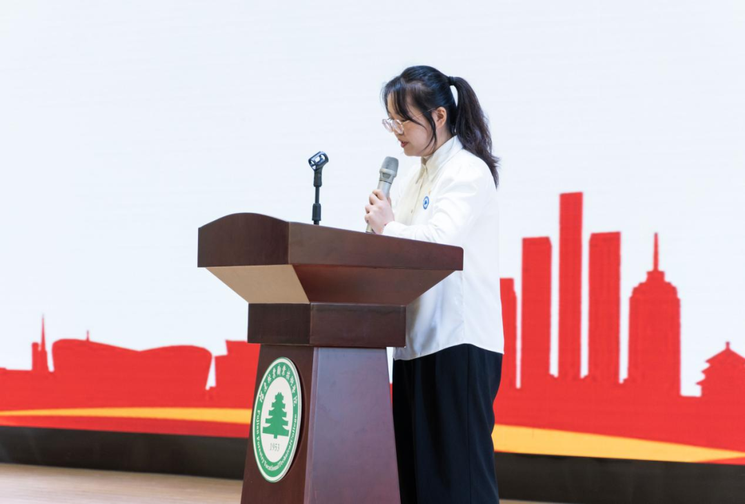 院团委组织部部长欧晓钖同学作为老团员代表发言,她希望新团员们能够谨记入团誓词,切实履行团员权利和义务,时刻以团员标准严格要求自己,努力成为一名优秀的共青团员。并提出以下三点要求:一、不断继承和发扬中华民族的优良传统,努力培养时代责任意识和家国情怀;二、珍惜大学时光,勤奋学习,努力提高自身综合能力与专业知识素养;三、诚信做人,自强不息,努力加强自身道德修养。
