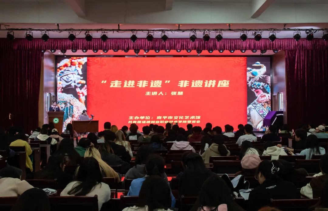 为弘扬中华优秀传统文化,丰富校园文化生活,加大南平非遗文化传播,提升学生综合素养。2023年12月13日下午15:00,由南平市文化艺术馆与福建林业职业技术学院团委联合主办的“走进非遗 (非物质文化遗产)"专题讲座在我院江南校区礼堂成功开展。讲座由南平市非物质文化遗产保护中心副主任、副研究员张慧老师主讲,我院师生代表两百余人到场聆听,院团委王美惠子老师主持本次讲座。