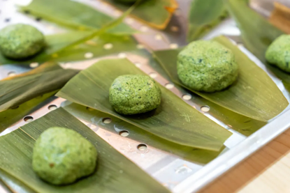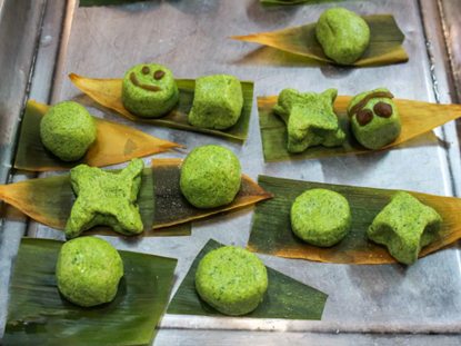 伴随着脑洞大开的想象力,原本圆嘟嘟的青团,摇身一变成了各种各样的形状。有笑脸,有星星,有熊脸……一个个都生动有趣,充满活力。
