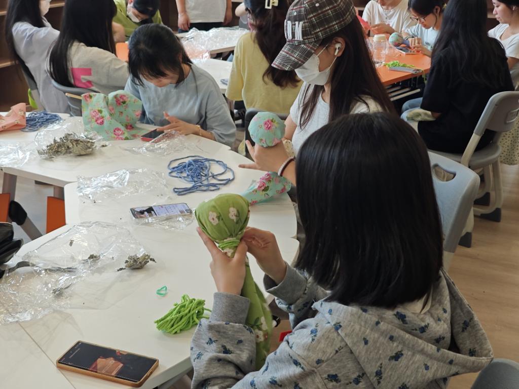 活动桌上,素色棉麻布、蓬松艾草绒、粗粝麻绳与木质手柄整齐排列,清新的草药香瞬间激活嗅觉!同学们迫不及待拆开材料包,化身“手作匠人”,开启沉浸式养生局。