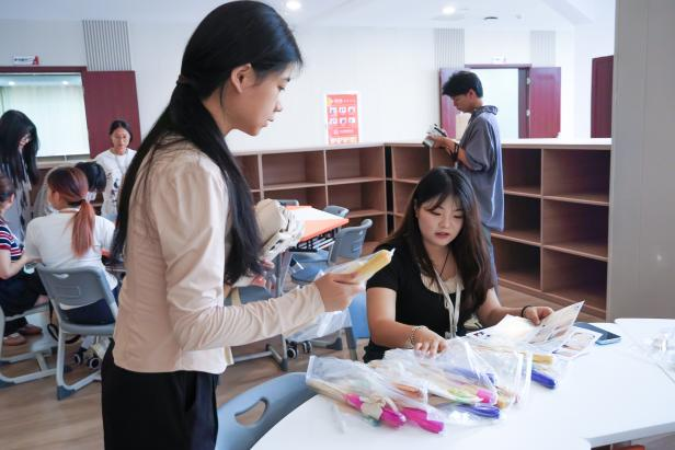 活动伊始,工作人员提前布置好充满雅韵的活动场地,并将竹篾、竹柄等制作材料整齐摆放。同学们陆续抵达后,在工作人员的引导下完成签到并领取材料包,有序落座。
