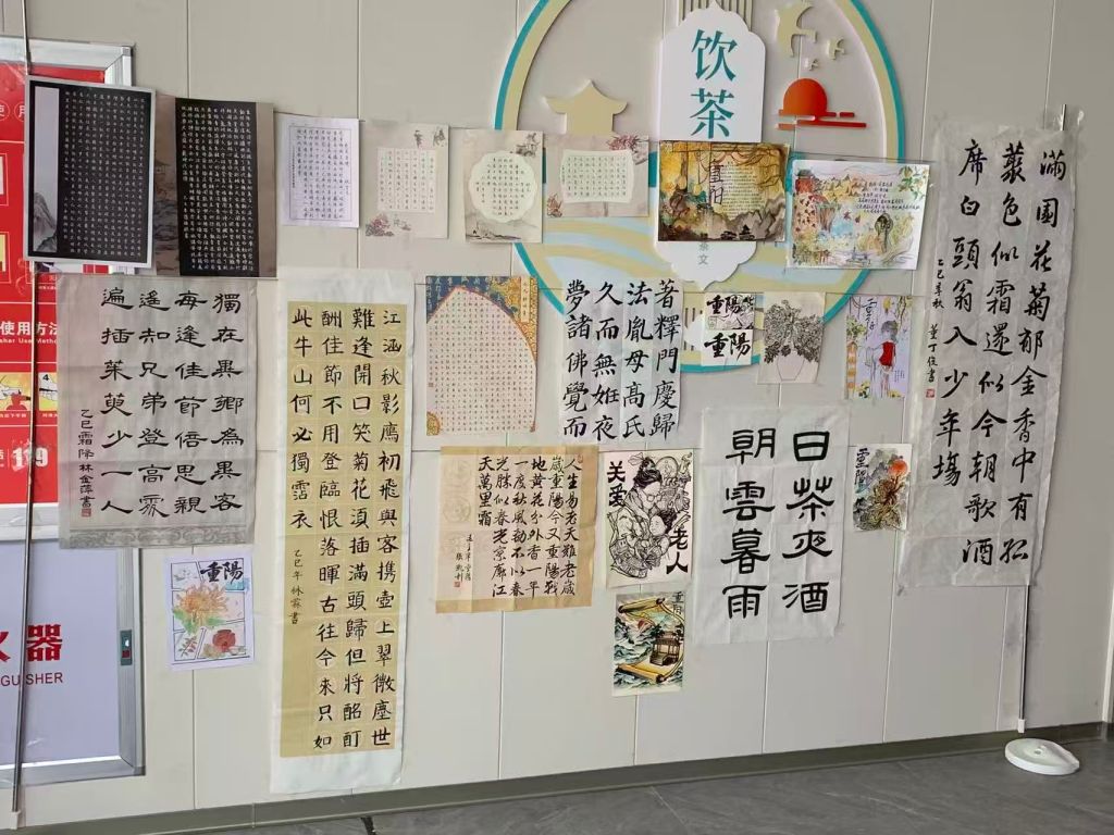 •墙间的节令与情长:二十四节气书画串成青绿的诗,《九月九日忆山东兄弟》的书法里,“遍插茱萸”的思念落满纸笺;菊绘晕开的金黄,恰是登高时撞见的漫山秋华;