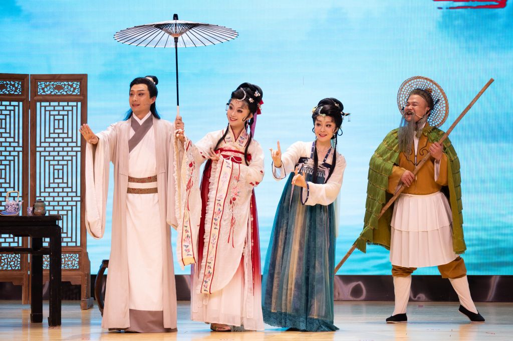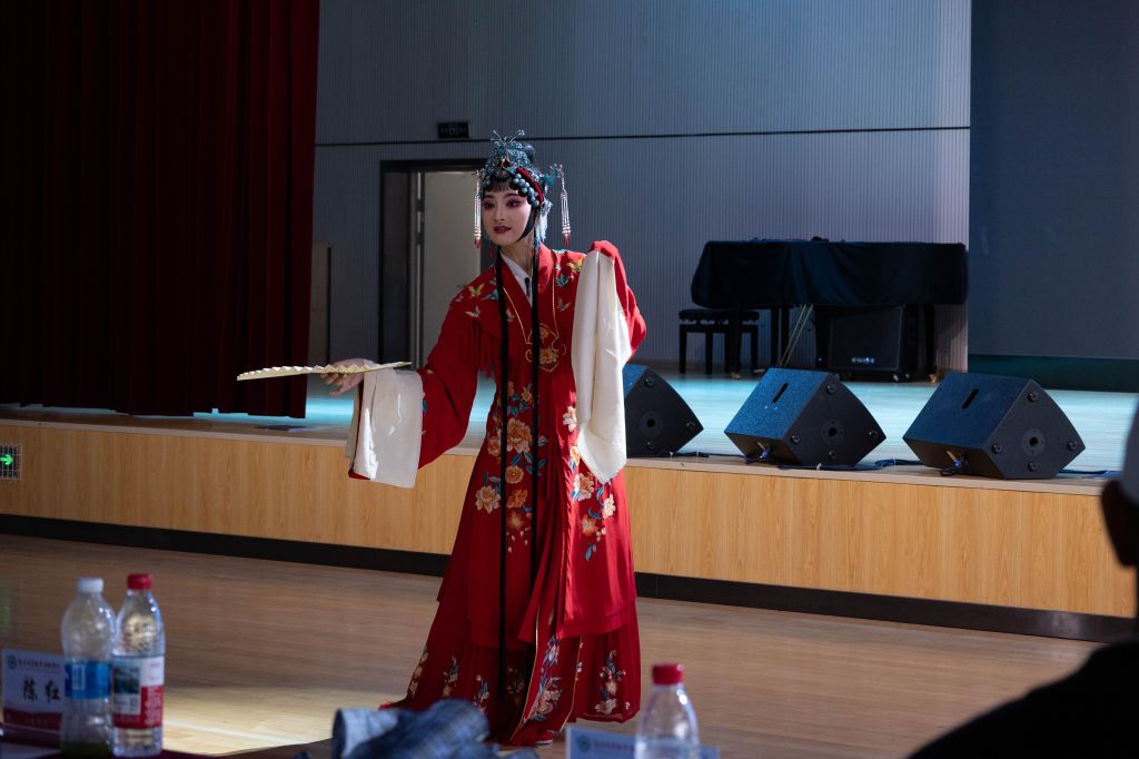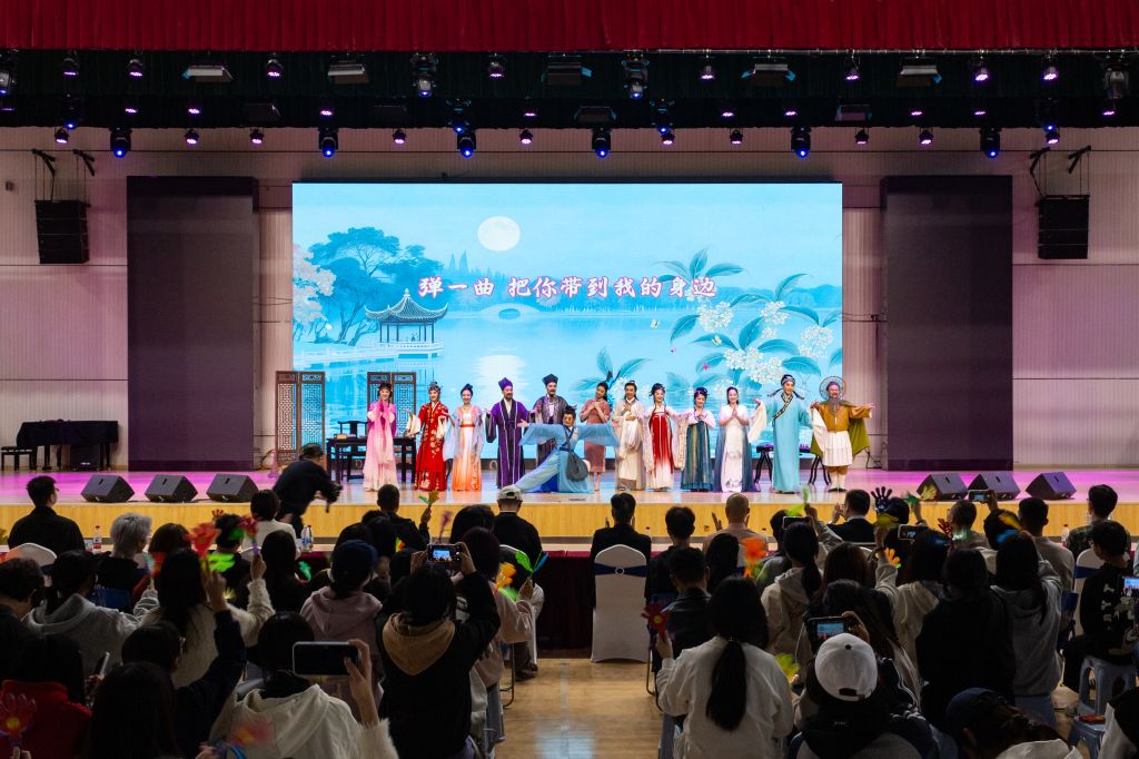 《福“见”儒林》以闽剧始祖曹学佺与四百年后福建省实验闽剧院的一位年轻演员跨越时空的相遇为故事主线,以“古今对话”的方式,巧妙地将优美动人的中国古典舞蹈、时尚动感的流行音乐、悠扬悦耳的古筝演奏与传统闽剧折子戏《双蝶扇·忆双蝶》《荔枝换绛桃·投荔》以及《白蛇传》选段融汇贯通,精彩纷呈。非遗闽剧沉浸式戏剧《福“见”儒林》受到我院广大师生的热烈欢迎。