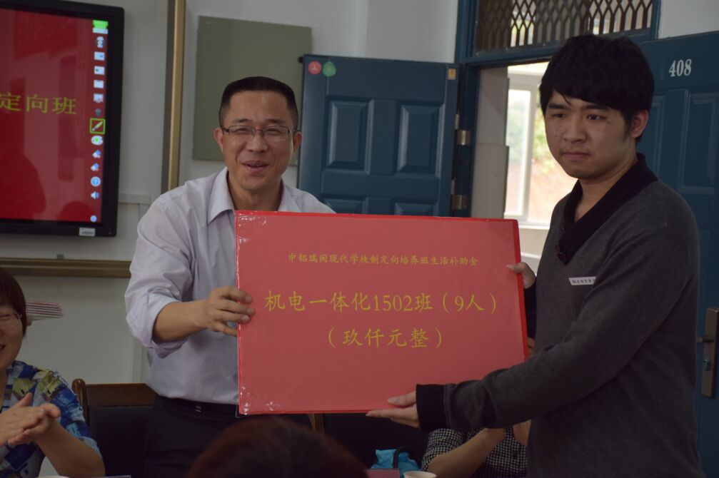 中铝瑞闽股份有限公司领导为定向培养板学员颁发企业生活补助金,每生每学年1000元,并鼓励学员虚心好学,勤练技能,日后能够成为企业的生力军、主力军。