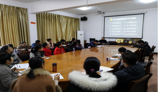 教师是人类灵魂的工程师,是人类文明的传承者。为引导广大教师努力成为有理想信念、有道德情操、有扎实学识、有仁爱之心的好老师,经管系党总支书记谢福荣于2018年12月25日下午3点在经管楼408会议室召开了关于“新时代高校教师职业行为十项准则”的学习会议。