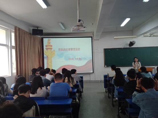 汪秀霞老师先是为我们解释了何为纪律,纪律就是规则,是指要求人们遵守业已确定的秩序、执行命令和履行自己职责的行为规范,是用来约束人们行为的规章、制度和守则的总称。纪律是党员不可触碰的“高压线”,也是政党不断壮大的“生命线”。汪老师先用处决勇冠三军的“革命功臣”黄克功的案例为我们说明了纪律的重要性,同时也引出了今天会议最主要的三点:一、全面加强党的纪律建设的历程。二、党的纪律建设取得的成效及面临的挑战。三、如何做遵守纪律的模范好学生。汪老师通过运用一系列数据和对案例的分析,使得大家充分认识到了纪律对于政党的重要性。