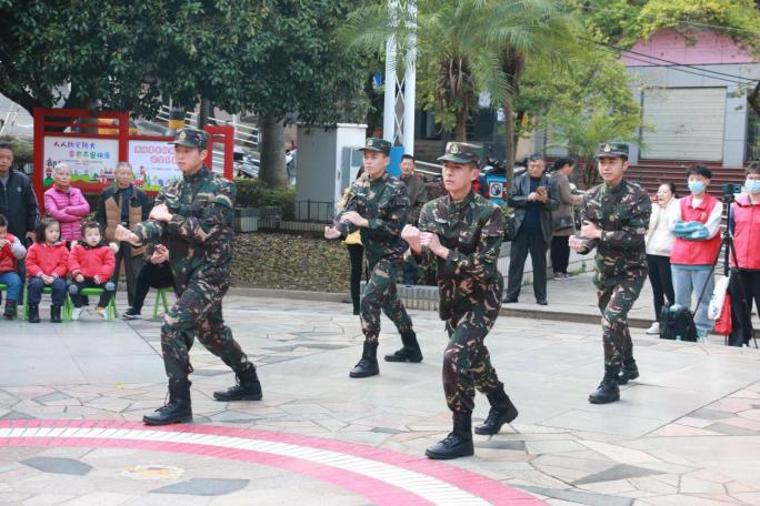 来自交通工程系的退伍士兵动作精炼,节奏分明,帅气的军装,飒爽的英姿,饱满激昂的气势,淋漓尽致的展现出了军人的风貌,贯耳冲膝、抓腕砸肘,随着一声声的口令,拳拳生风,犹如出海蛟龙,下山猛虎,紧紧吸引着孩子们的目光,迎来幼儿们的热烈喝彩。在互动环节,着迷彩妆的孩子们脸上洋溢着兴奋与喜悦,在教官的指导下进行一系列的军姿队列训练,身躯在站军姿时同样笔挺,在卧倒时同样神情坚定,在匍匐前进时亦是有模有样……在教官和孩子们的对歌环节,现场气氛达到高潮,此起彼伏的歌声,稚嫩、嘹亮的的声音,响彻全场,饱含着孩子们积极向上的力量!