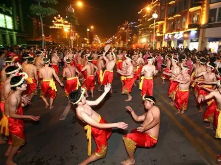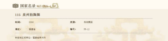 拍胸舞表演者所戴草箍上的蛇形头饰保留了秦汉闽越族原住民蛇图腾崇拜的遗风,其表演形式也保留了古闽越族原始舞蹈的遗风。拍胸舞的内在动律与土家族舞蹈“肉连响”极其相似,从舞种分布的角度看,它与黎族、高山族等南方少数民族的舞蹈之间存在着密切的渊源关系。泉州古老剧种梨园戏《郑元和》中保留了“莲花落”乞丐拍胸一折,当今民间拍胸舞又使用、保留了泉州南音的《三千两金》,这种文化的传承关系也极具研究价值。
