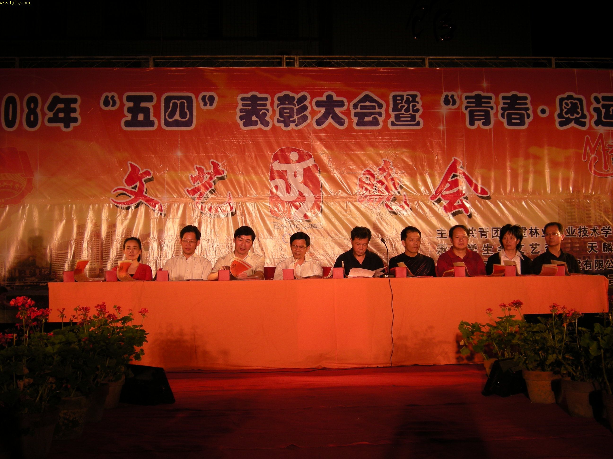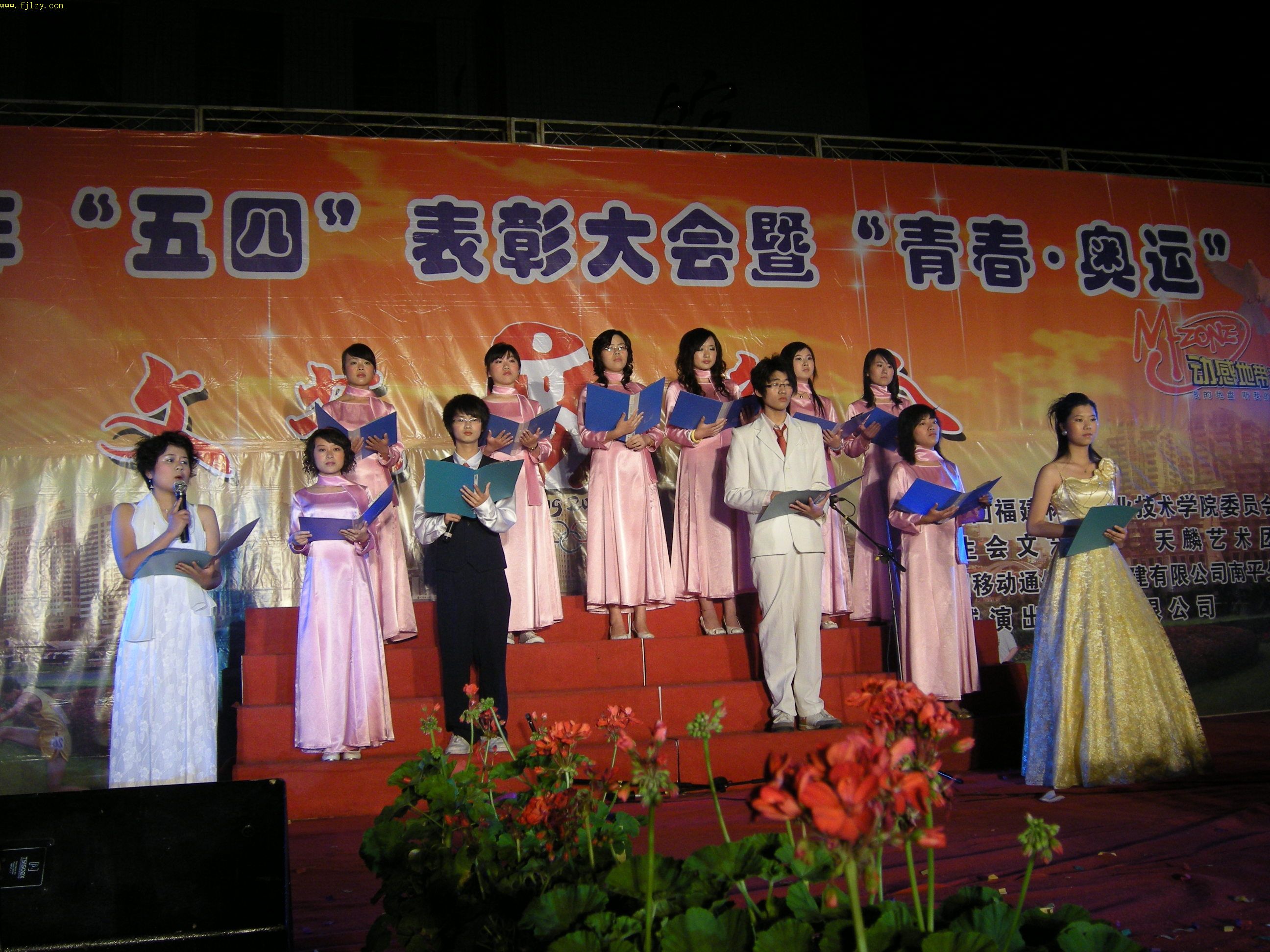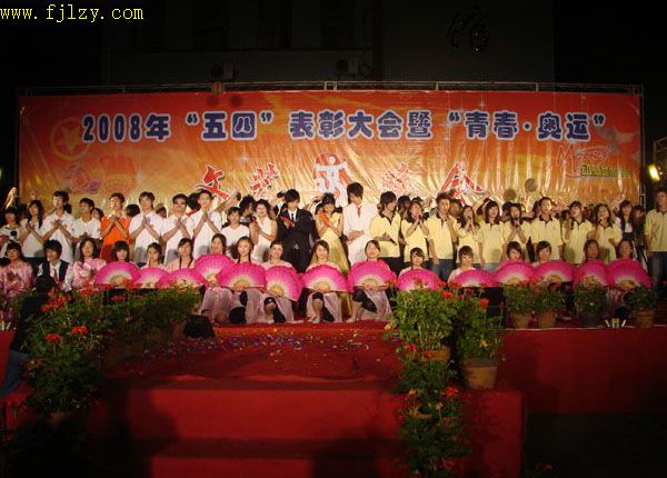 5月11日晚,由院团委会主办、院学生会文艺部、天麟艺术团承办、中国移动通信集团南平分公司、南平市祥威演出设备有限公司协办的2008年“五四”表彰大会暨“青春·奥运”文艺晚会在院篮球场隆重举行。党委书记徐志荣、党委副书记兼纪委书记刘明、副院长章志勇、王振亮、学生处处长郭先根、院长助理刘文开及各系主任受邀成为晚会嘉宾。各系学生组组长、团总支、辅导员以及2007级全体同学到场观看演出。