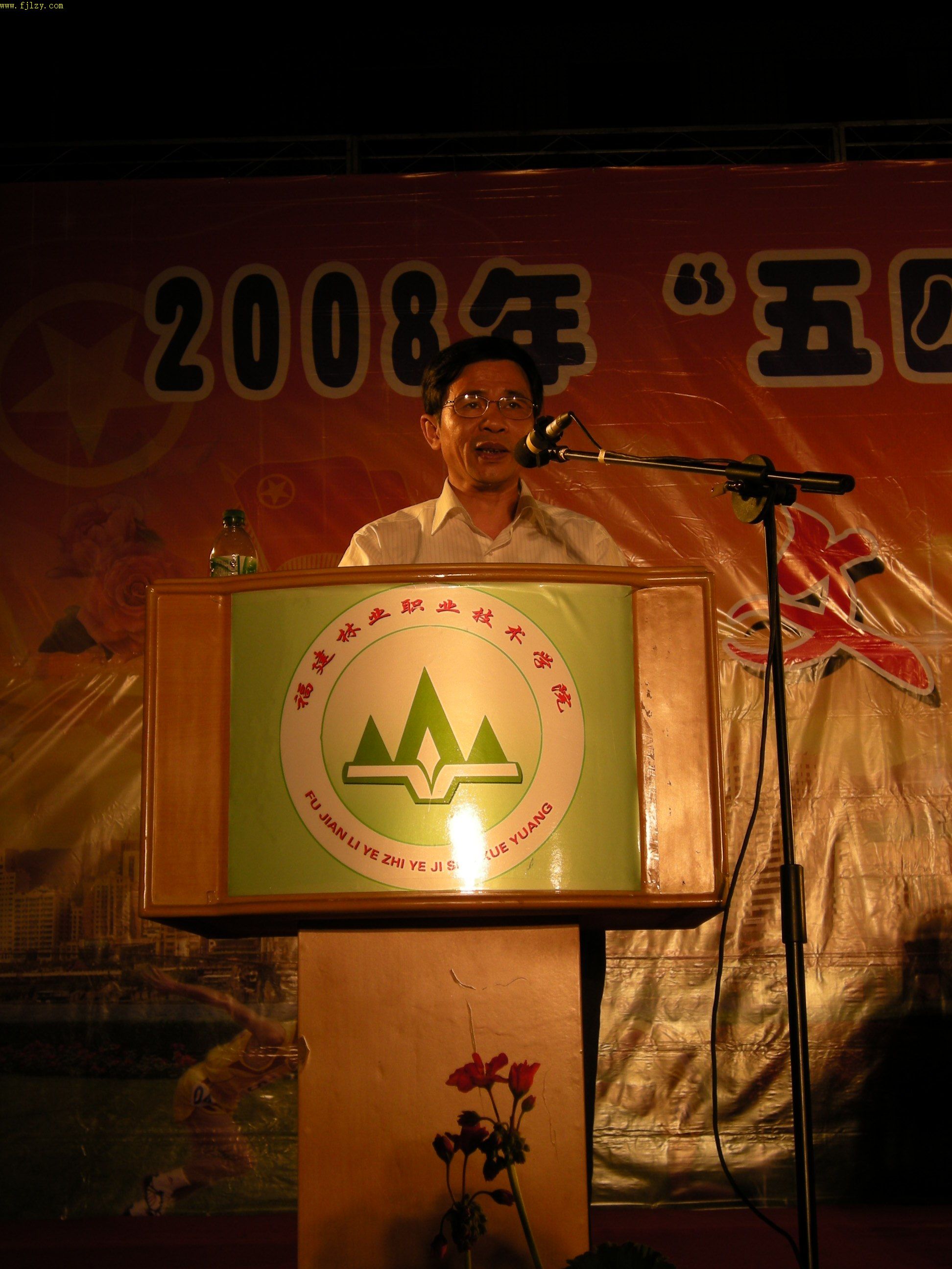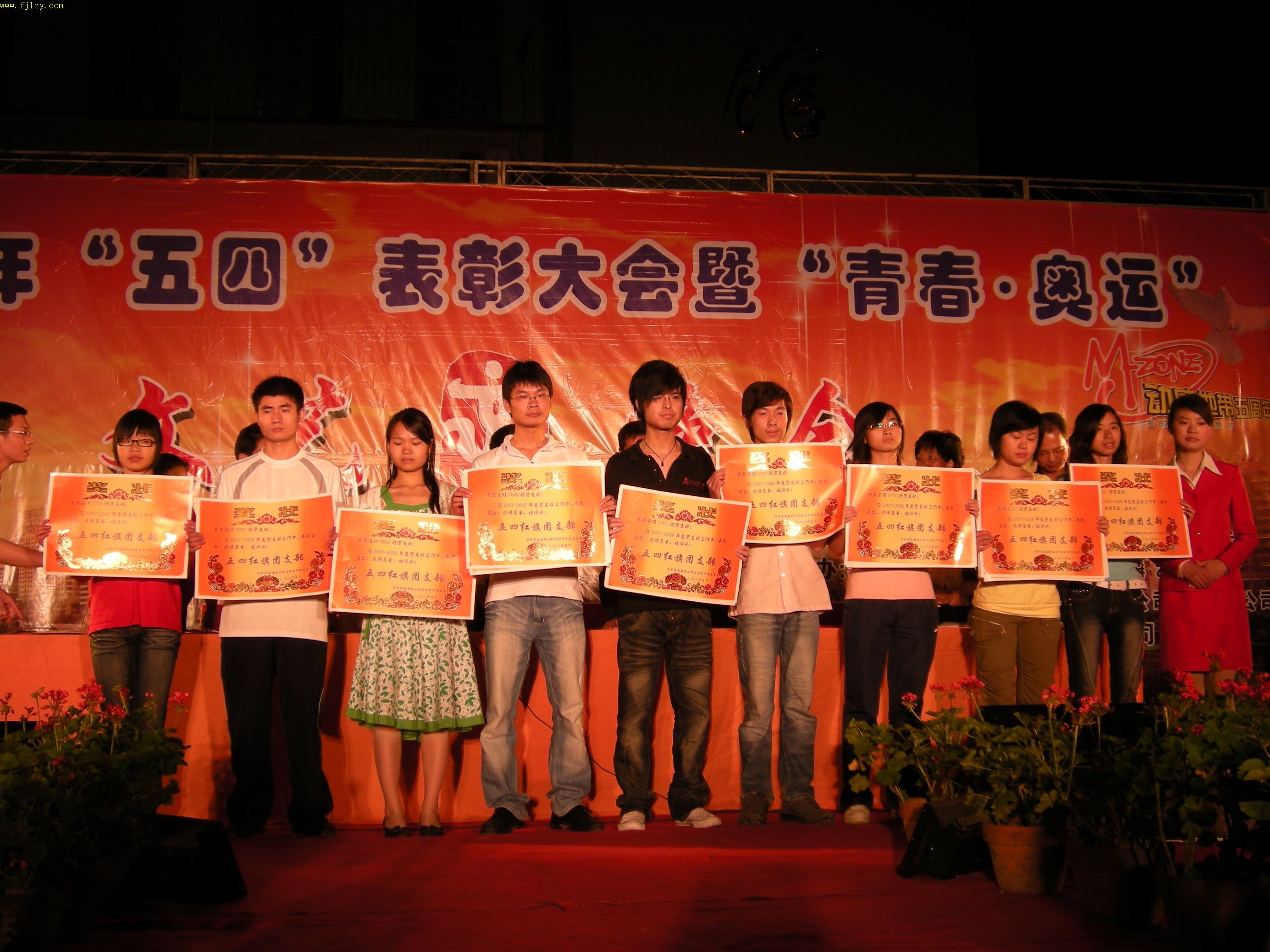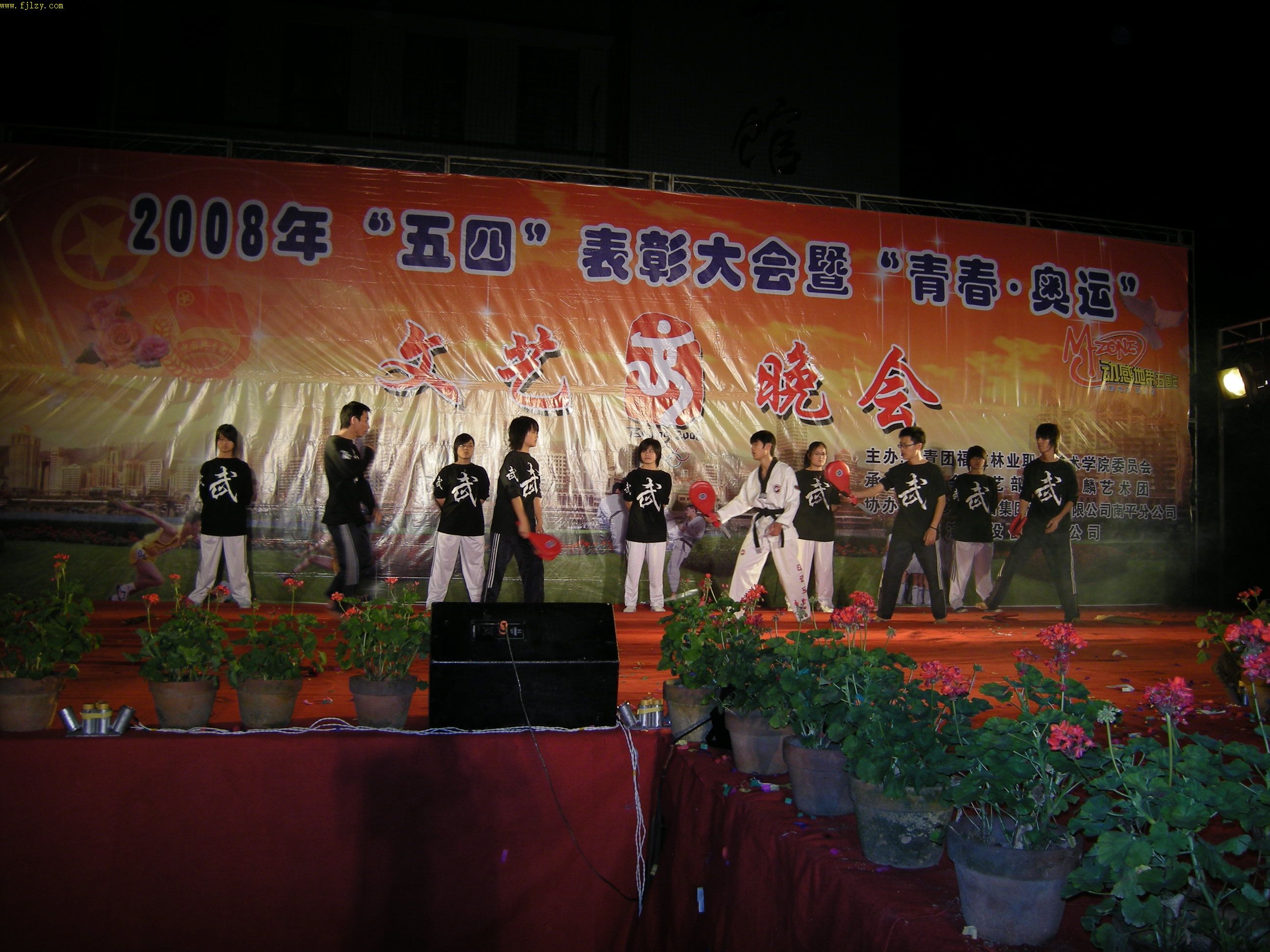 5月11日晚,由院团委会主办、院学生会文艺部、天麟艺术团承办、中国移动通信集团南平分公司、南平市祥威演出设备有限公司协办的2008年“五四”表彰大会暨“青春·奥运”文艺晚会在院篮球场隆重举行。党委书记徐志荣、党委副书记兼纪委书记刘明、副院长章志勇、王振亮、学生处处长郭先根、院长助理刘文开及各系主任受邀成为晚会嘉宾。各系学生组组长、团总支、辅导员以及2007级全体同学到场观看演出。