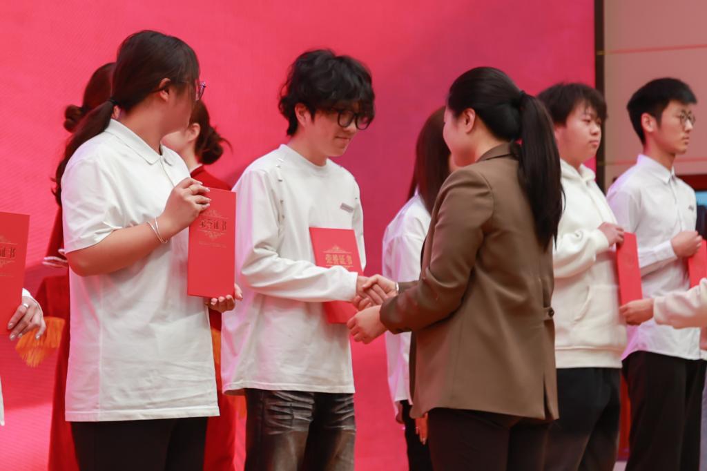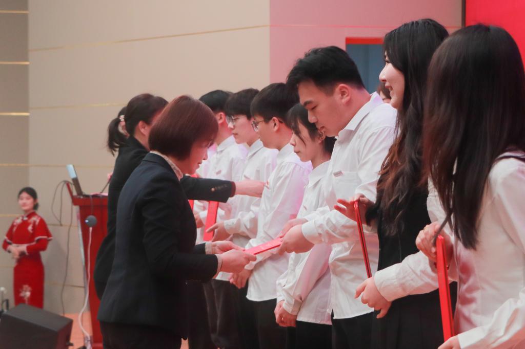▲组织部(统战部)部长李霞、宣传部部长、马克思主义学院院长邹小燕为8位“社团优秀会长”代表颁奖