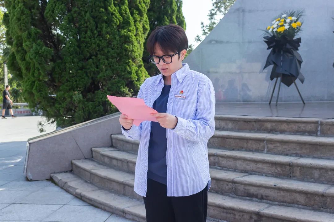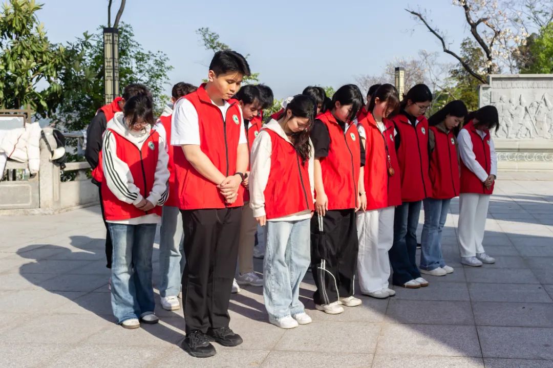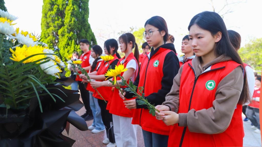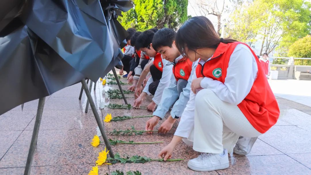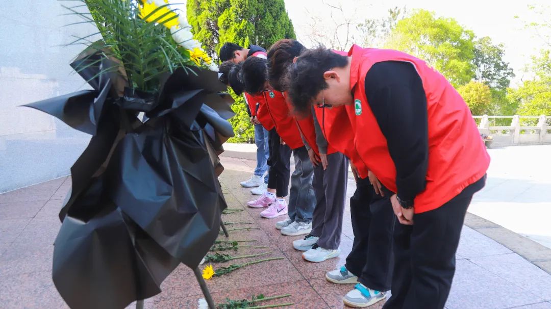 紧接着,全体青年依次上台,将菊花轻轻摆放在碑前。一支支素净的鲜花,是青年学子对革命先烈的深情告慰;一个个庄重的鞠躬,是新时代接班人对历史使命的庄严承诺。