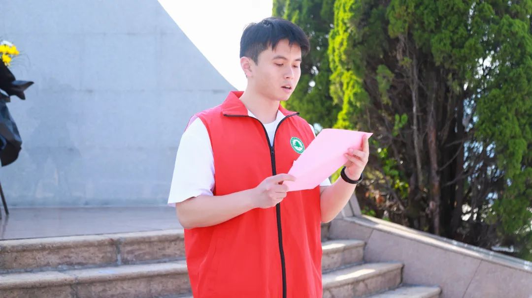 院学生会轮值主席冯天顺同学上台致辞,他强调:“正是无数先烈的流血牺牲,才换来今天的和平幸福生活。作为新时代青年,要以全国两会精神为指引,将爱国之情转化为强国之志,让英烈精神在传承中绽放时代光芒。”
