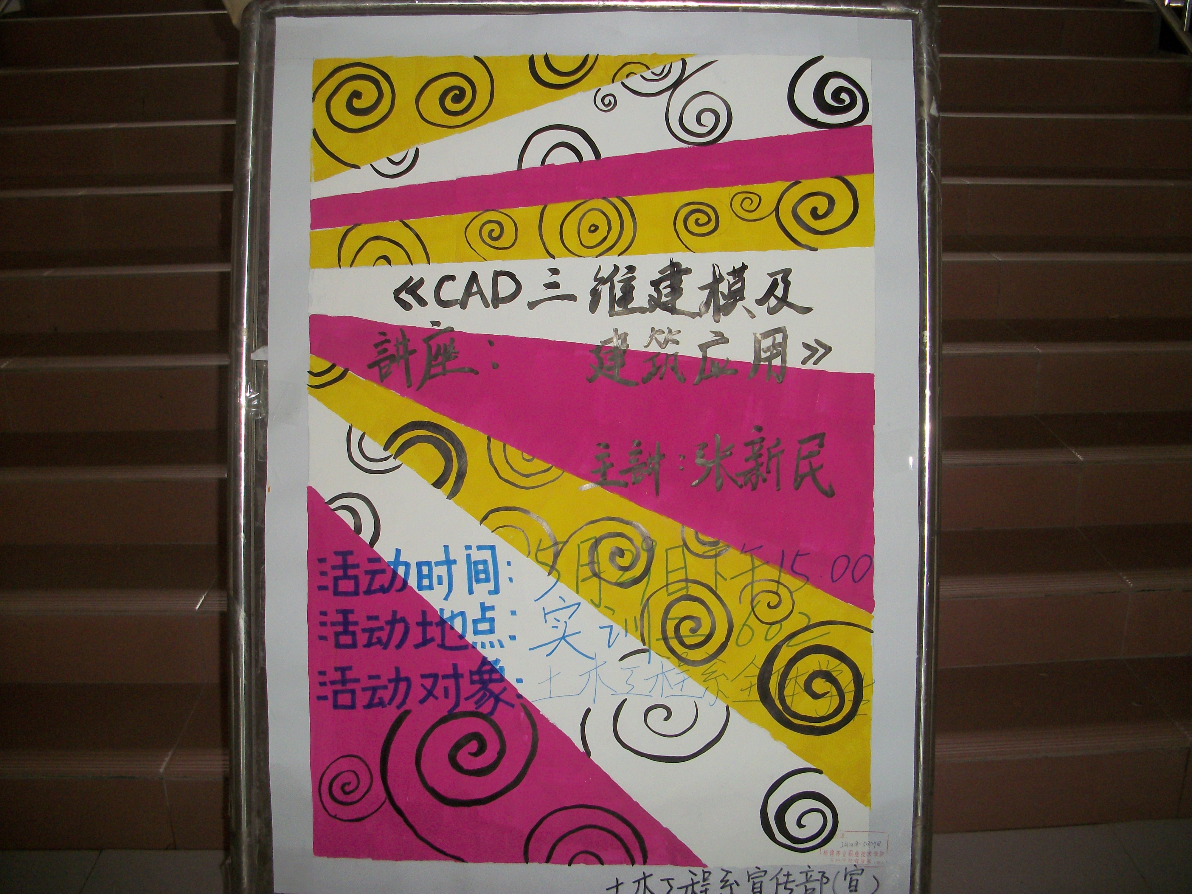 张新民老师在讲座中,做出了非常精彩的演讲,为同学们讲述CAD应用中构建三维模型的理论知识,以及专业操作,从创建UCS到整个图形的完成。张老师形象生动的讲解让同学们更加深刻地了解CAD三维建模,不仅丰富了大家的课余生活,还充实了同学们的专业知识,让同学们对CAD有了新的认识,认真研究,使它成为大家今后学习和工作的助手。同时,也让同学们意识到要培养良好的绘图习惯,保持严谨的态度,运用科学的学习方法,这样各项工作才能游刃有余!