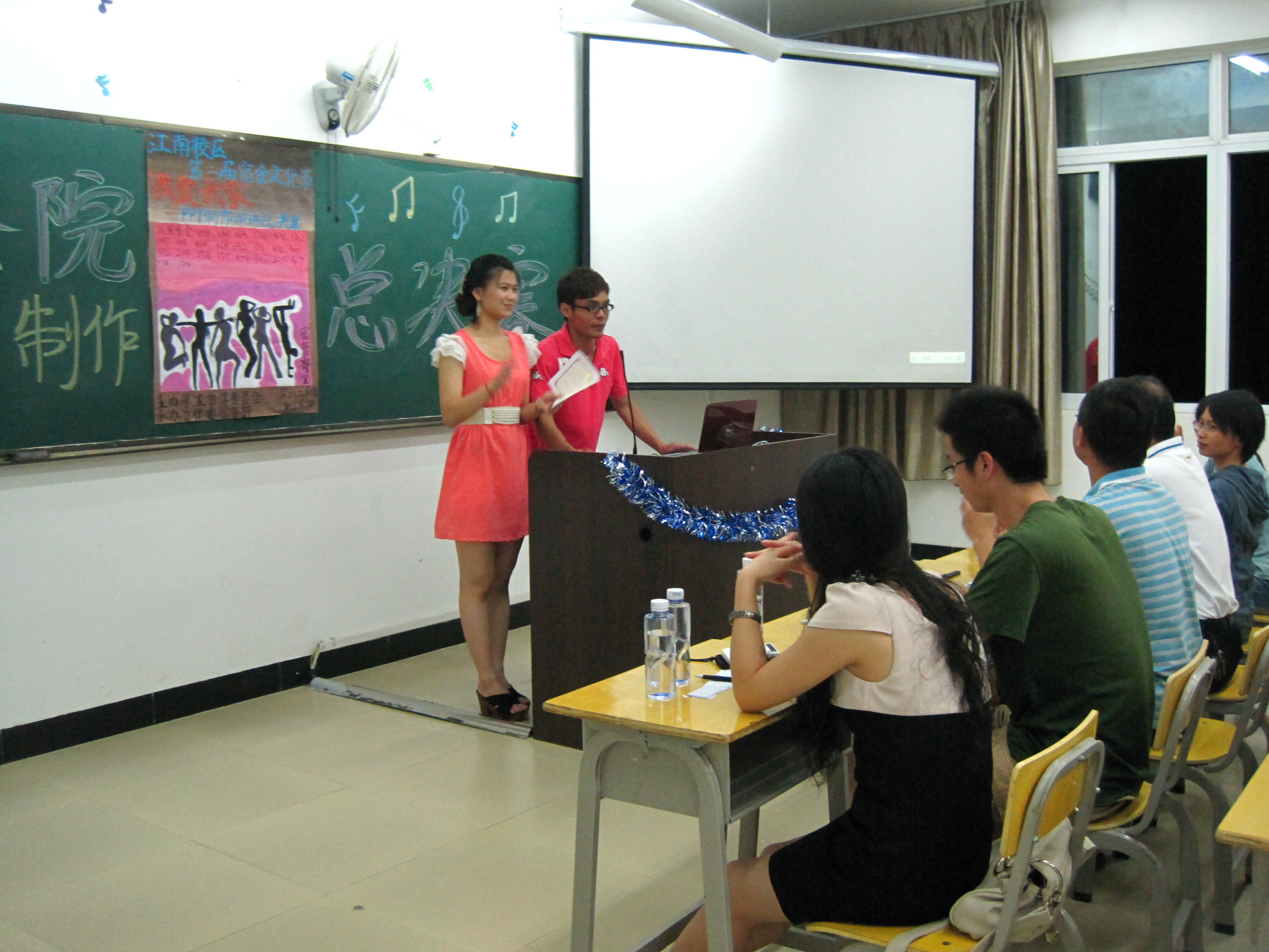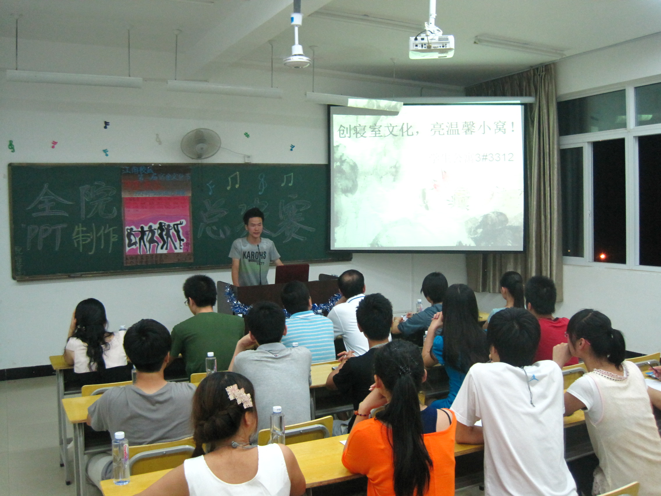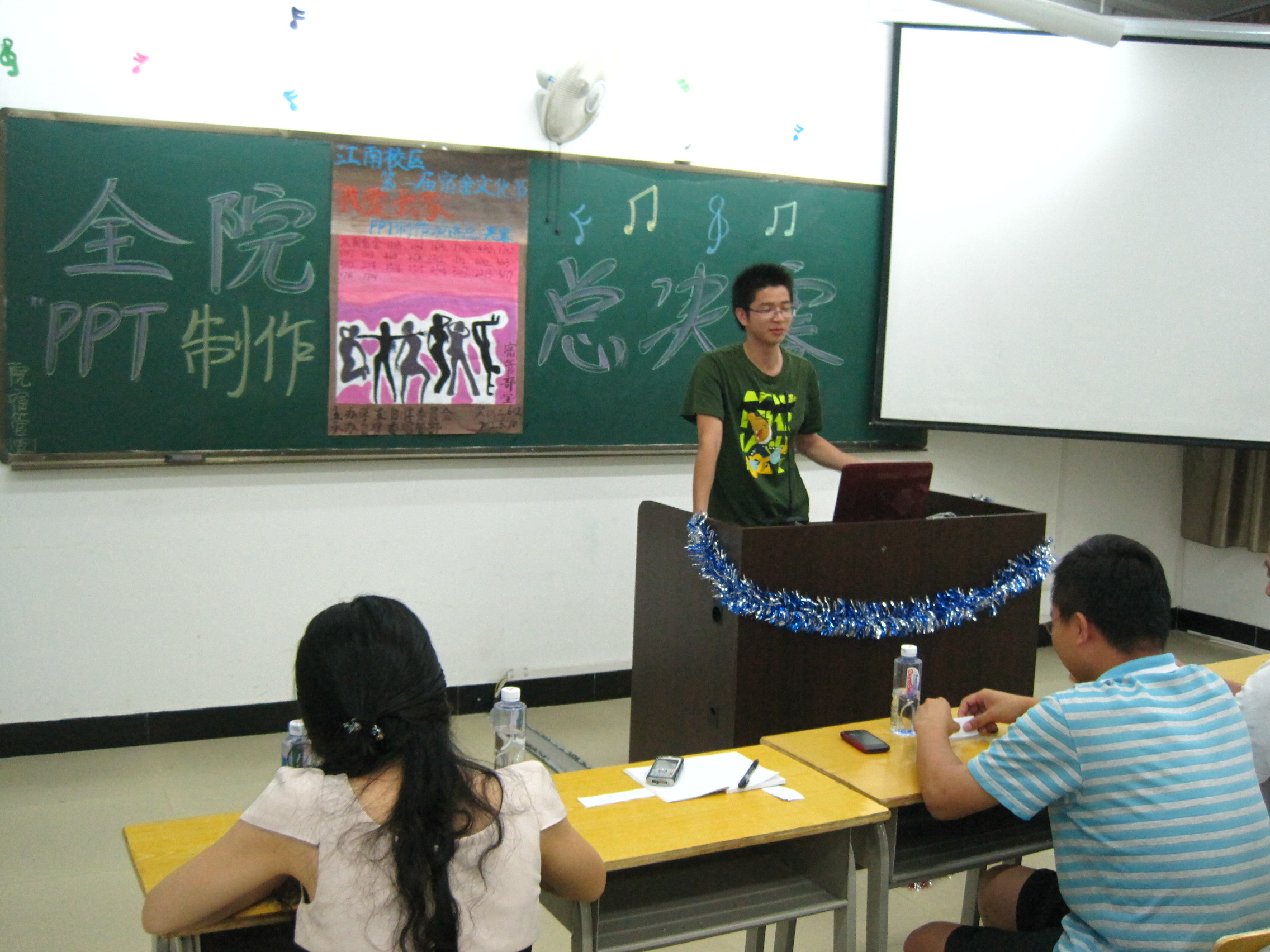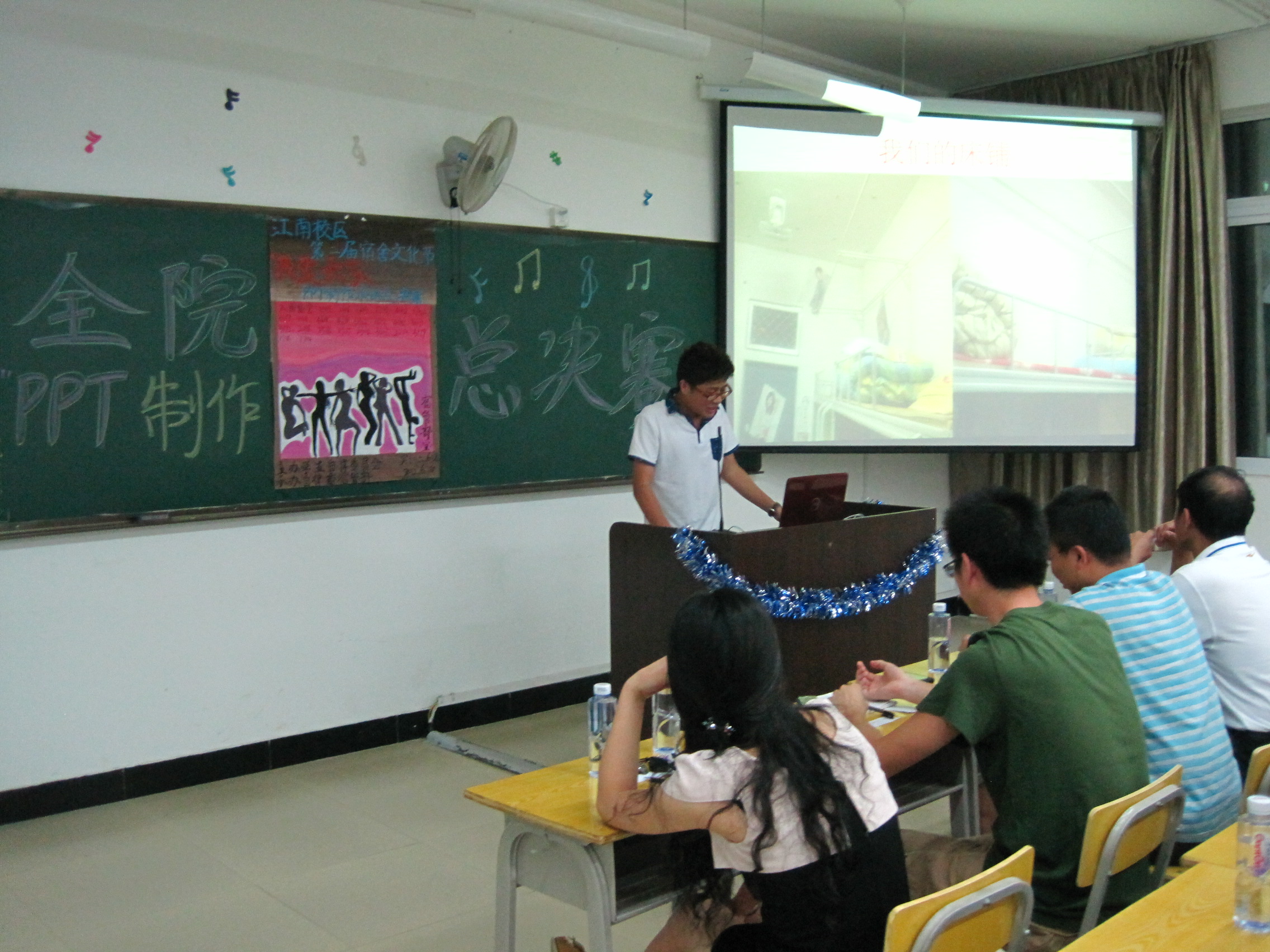 6月10日晚7点整,在实训二号楼602室举办第二届宿舍文化节——全院PPT制作总决赛。本次比赛由院自律委主办,院自律委宿管部承办,邀请了江南校区学保科科长徐洪,资环系学生工作专职副书记、学工组长姚平生,工程系团总支书记郑平芳,学保科老师吴旻,院团委老师廖素梅,院学生会老师陆晓莉,自律委主席曾荣发、蒋炜航,助发委主席许娇芳,助发委副主席吴哲昆以及学生代表周瑞金担任评委。