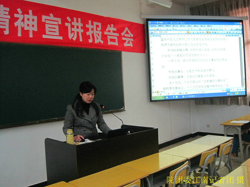 11月27日下午3点整,“学习党的十八大精神宣讲报告会”在我院江南校区实训四号楼310室拉开帷幕,此次报告会有不少入党积极分子参与其中,共同见证党的发展历程。