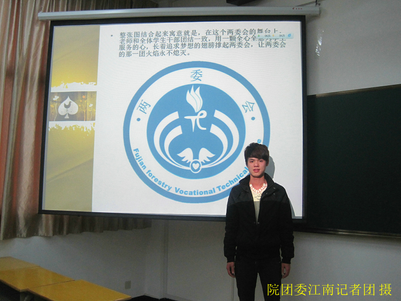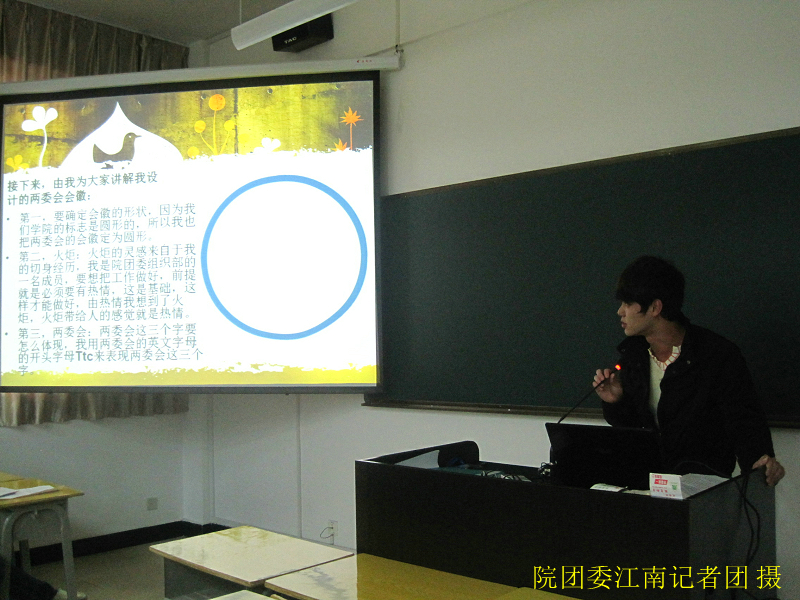 在比赛过程中,各参赛选手都通过PPT形式来展示和说明自己会徽设计的灵感依据和形成会徽的缘由,不仅增加了现场观众的兴趣,也使得各评委有了评判选手成绩优良的指标。其中,8号选手曾显根同学以其出色的会徽设计理念令观众折服。设计中心是以一对环绕在一起的翅膀为主,是一对象征着两委会团结协作的翅膀。其它9位参赛选手的作品和演讲也非常出色,获得了现场观众阵阵热烈的掌声。