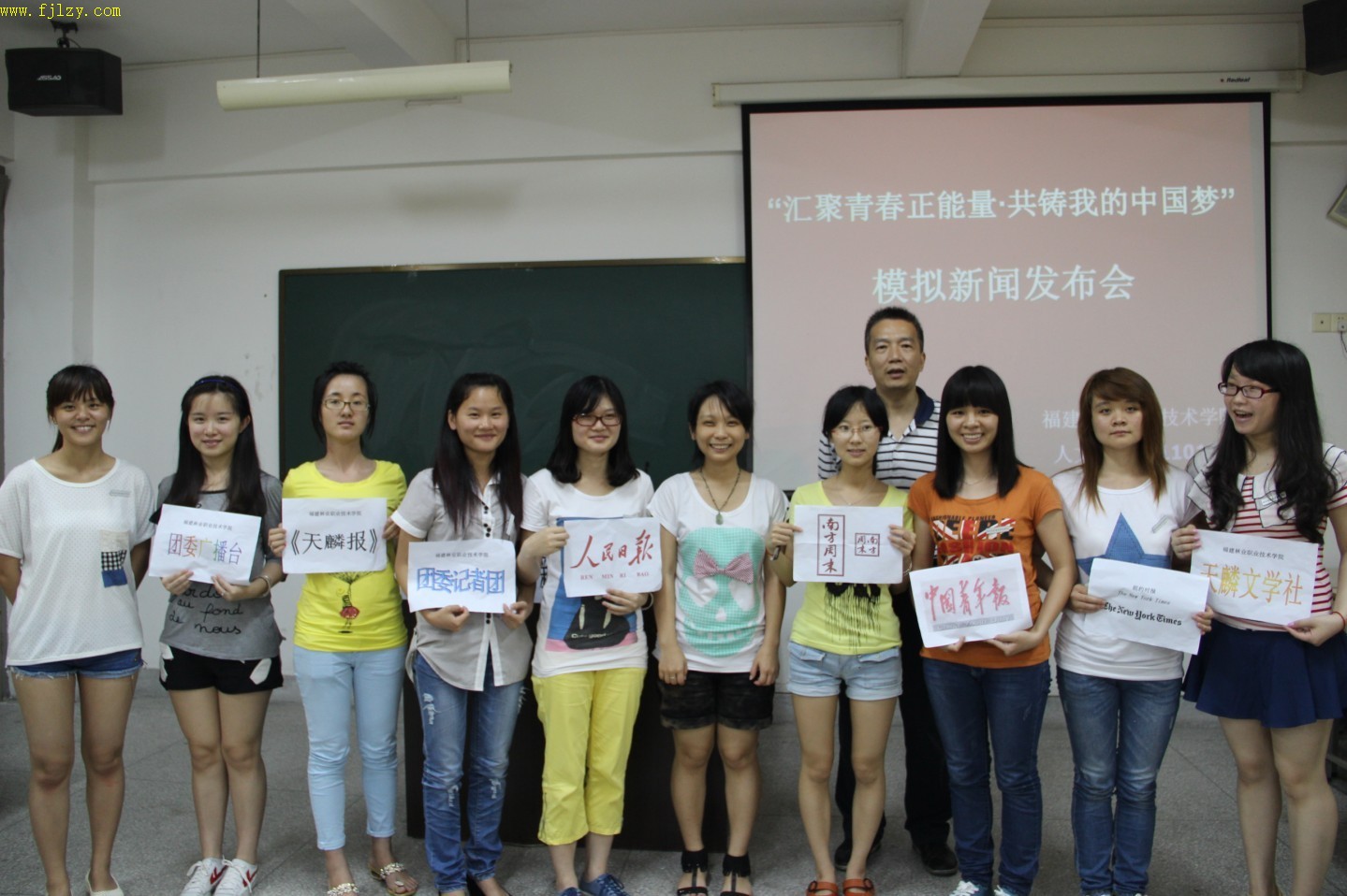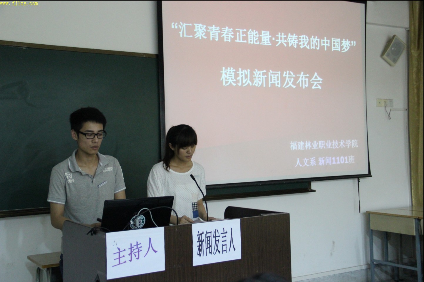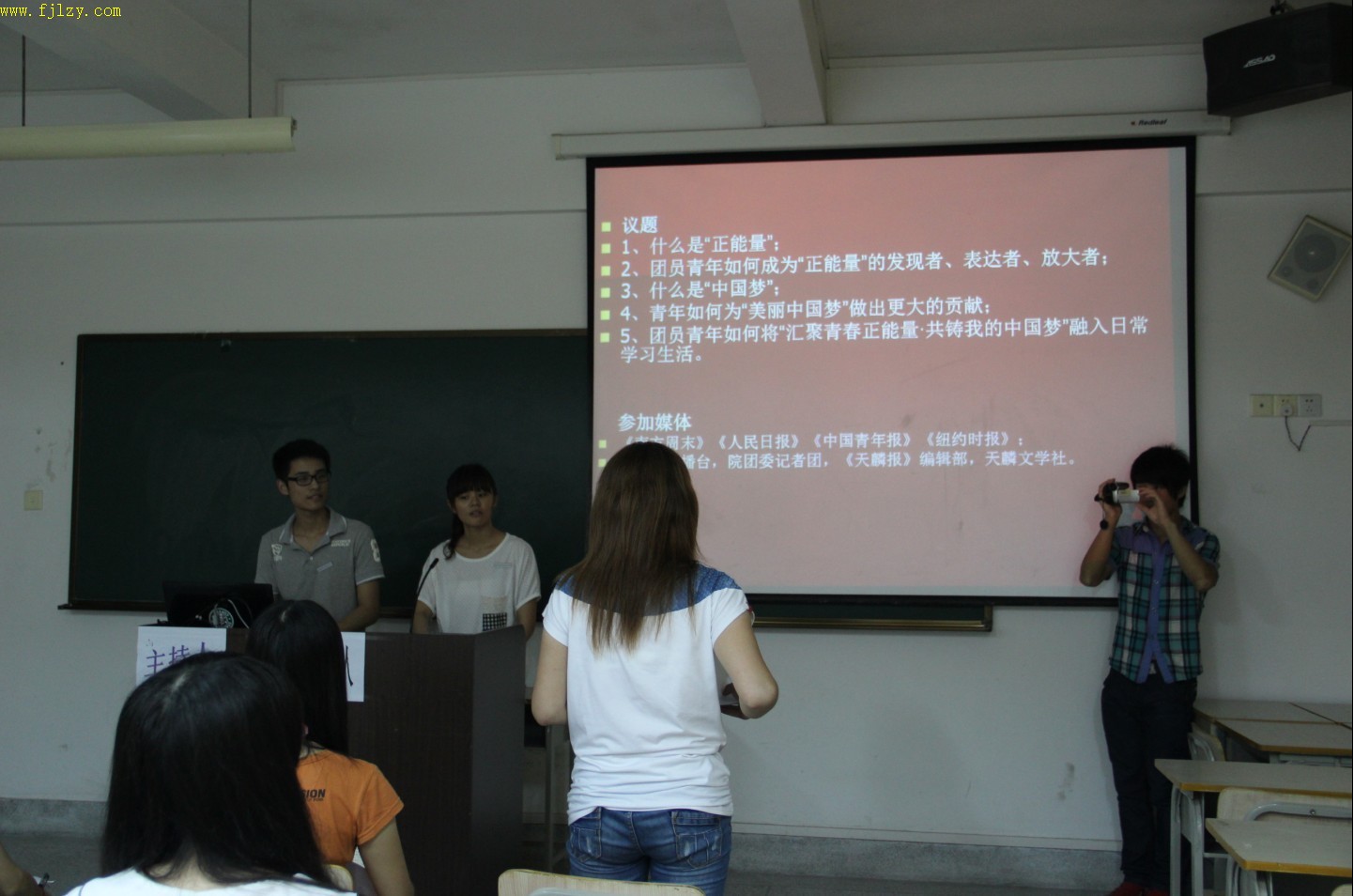 2013年6月6日19时,人文社科系新闻1101班团支部青年学生如何解读“汇聚青春正能量共铸我的中国梦”专题模拟新闻发布会在天麟校区科教楼504展开。此项活动是我院 “汇聚青春正能量 共铸我的中国梦”主题团日立项活动重点立项项目。