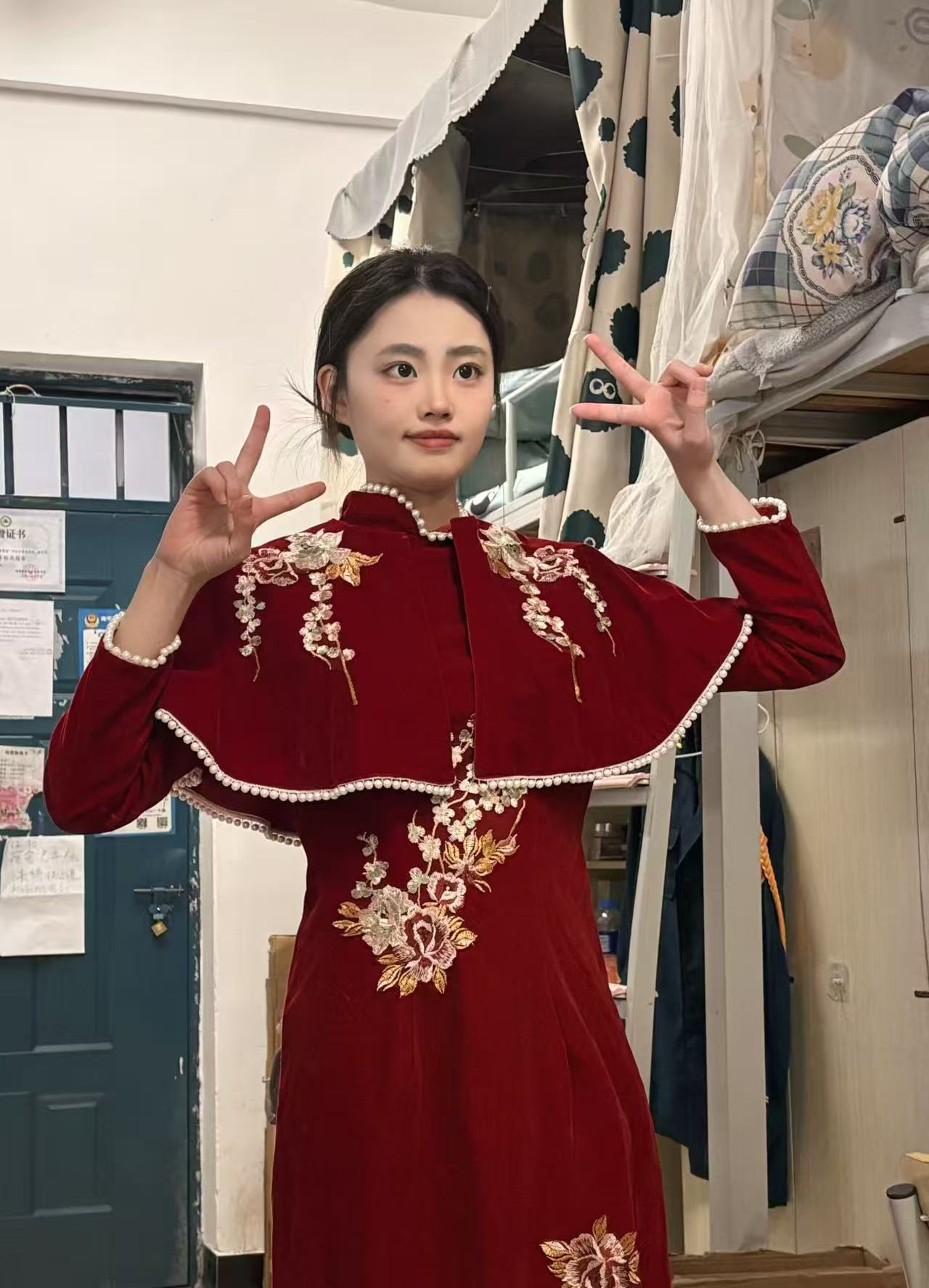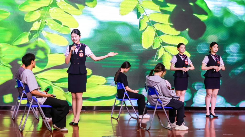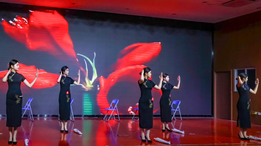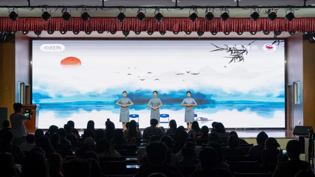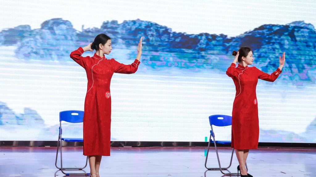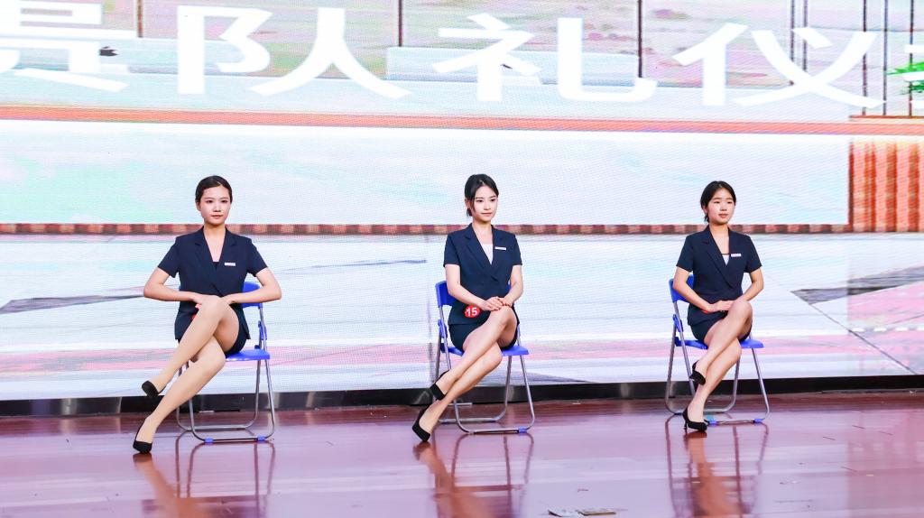 灯光渐亮,舞台中央的选手静立如松。双脚呈丁字步,脊背挺直如竹,双手交叠于腹前,连呼吸的幅度都克制得恰到好处。随着音乐变换,一系列礼仪动作如行云流水般展开:30度鞠躬时发丝纹丝不动,引导手势精准定格在45度角,递接物品的瞬间指尖与杯沿保持恰到好处的距离。每一个转身都带着恰到好处的停顿,每步行走时裙摆荡起的弧度仿佛经过精密计算。她们的一言一行,一举一动,无不体现着优雅得体,彬彬有礼。