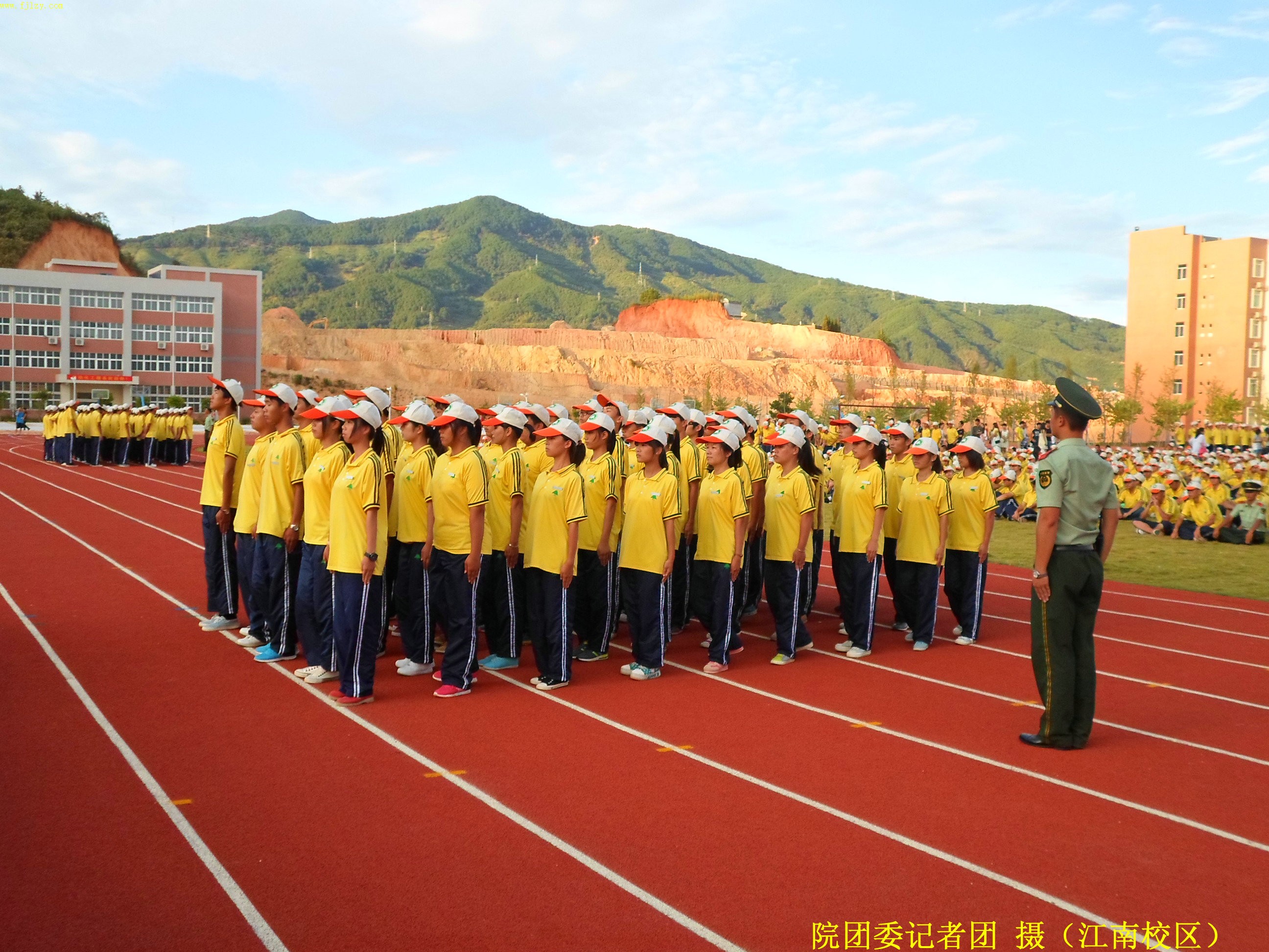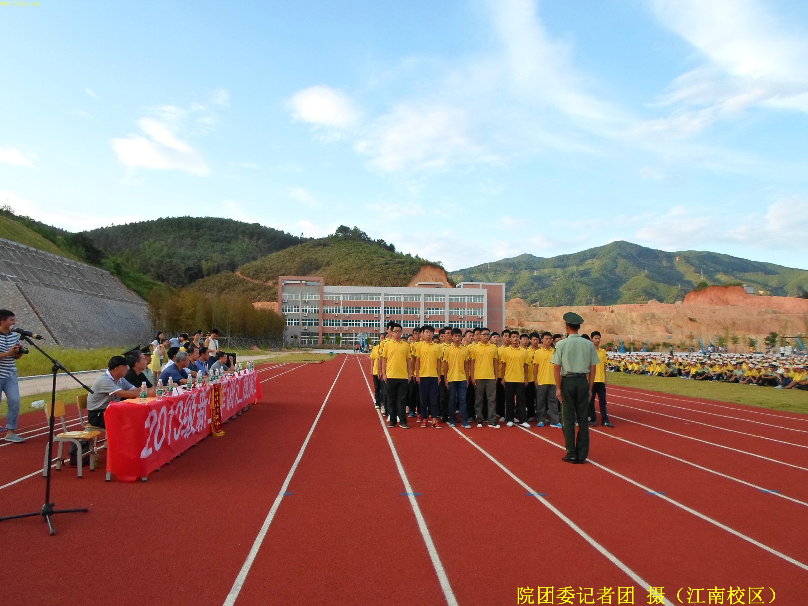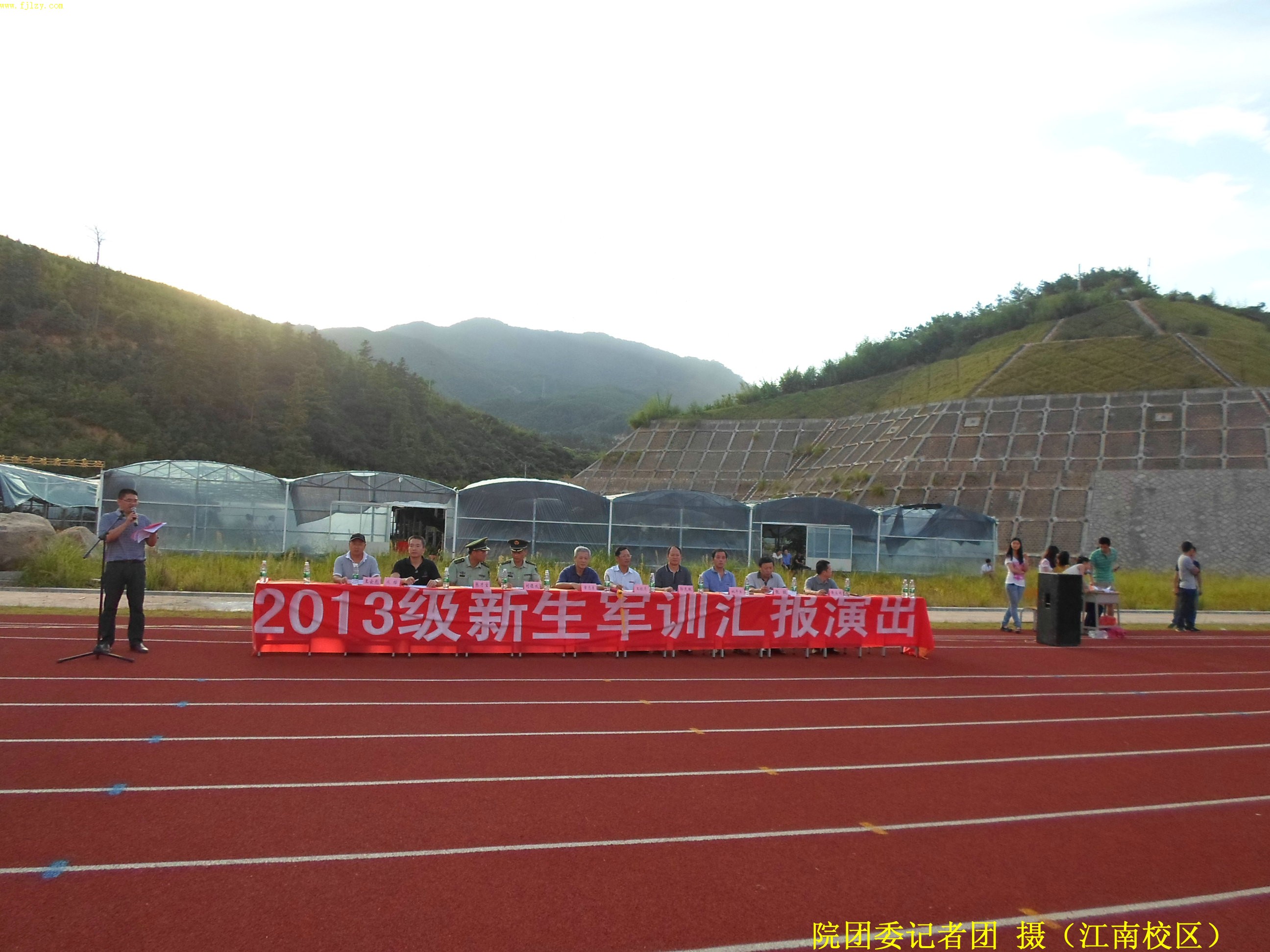 2013年9月13日下午五点,我院江南校区在后操场举2013级新生军训汇报表演。武警部队南平市森林支队副参谋长刘德成同志,武警部队南平森林支队南平大队教导员张才宝同志,学院纪委书记章志勇老师,学院副院长王振亮老师,学院院长助理、学生处处长郭先根老师,人文社科系主任、党总支书记成榕老师,资源环境系党总支副书记姚平生老师,土木工程系党总支副书记王云彪老师,经济管理系党总支副书记张毅老师,自动化工程系教学秘书、学工组组长黄立靖老师,应邀出席并担任本次会操评委。