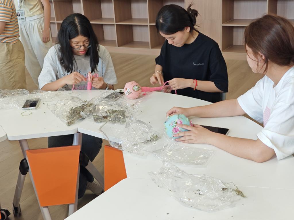 活动桌上,素色棉麻布、蓬松艾草绒、粗粝麻绳与木质手柄整齐排列,清新的草药香瞬间激活嗅觉!同学们迫不及待拆开材料包,化身“手作匠人”,开启沉浸式养生局。