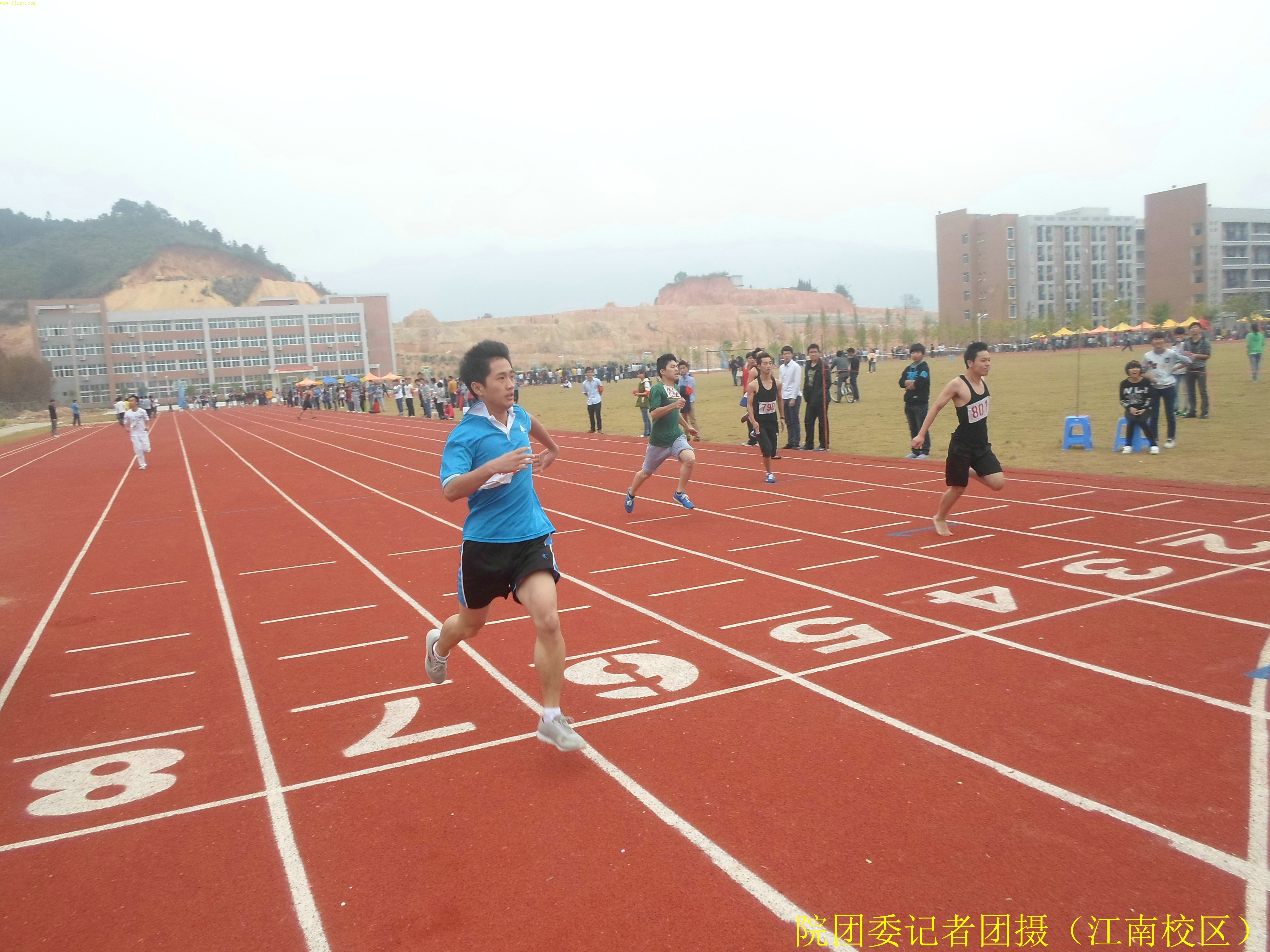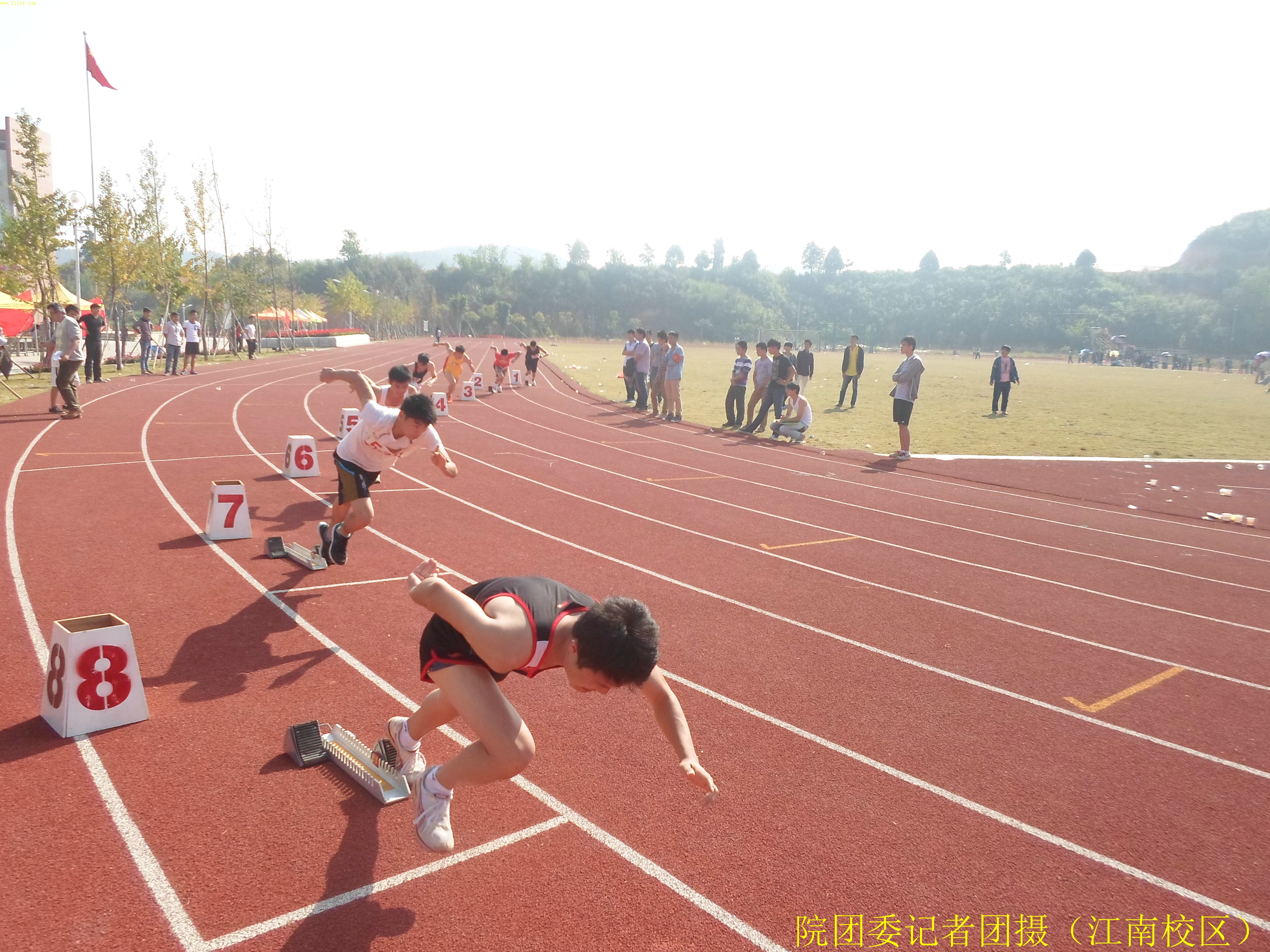 11月7日下午1点30分,男子100米决赛在我院江南校区田径场举行。加油助威的同学们早已围成一堵厚厚的人墙,挤个水泄不通。