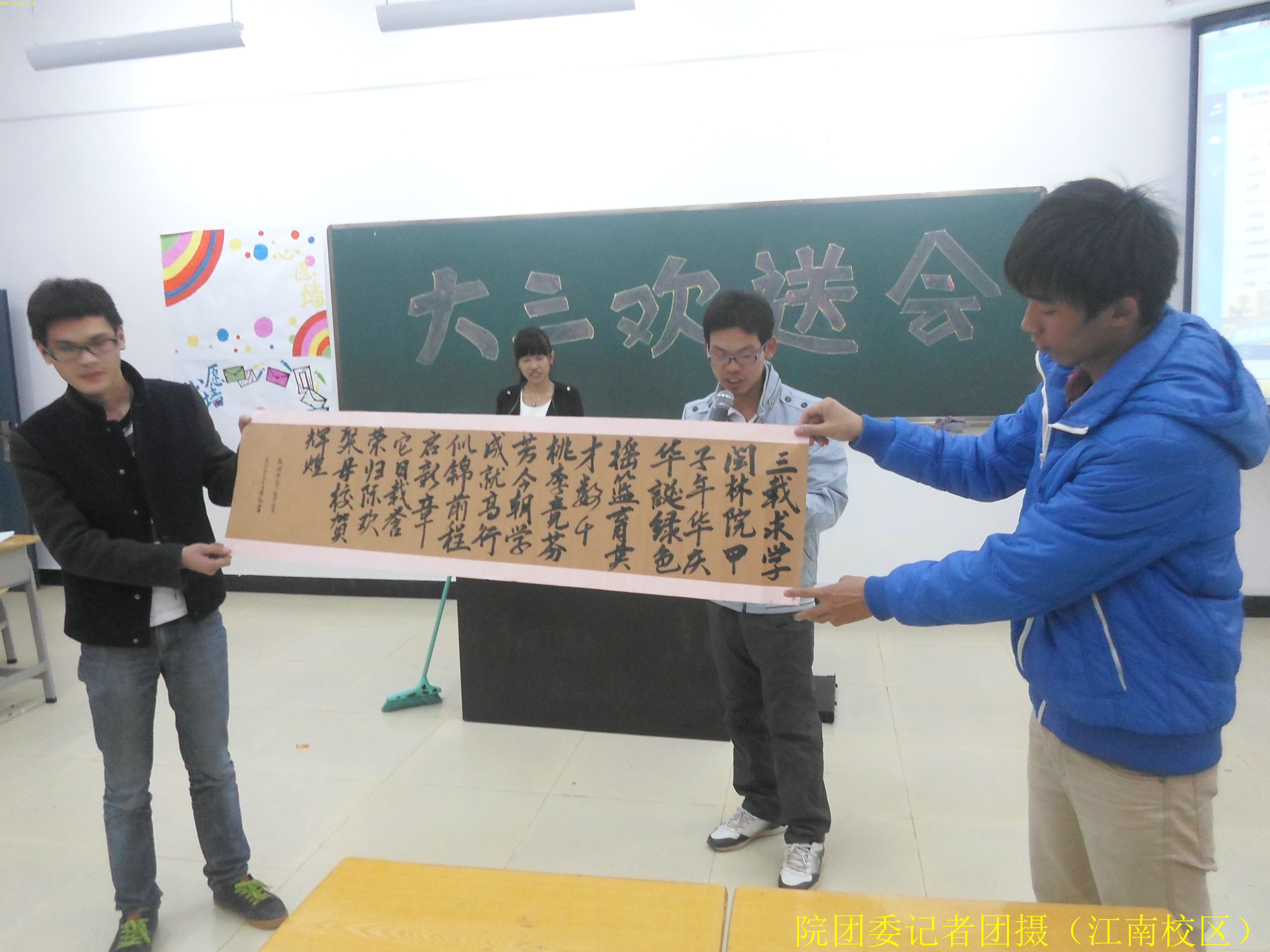 11月19日下午2点整,我院江南校区在实训四号楼410室举行院江南校区学生会、团委会两委会“大三欢送会”。出席此次活动的有院江南校区两委会各部门部长,干事及各协会会长。