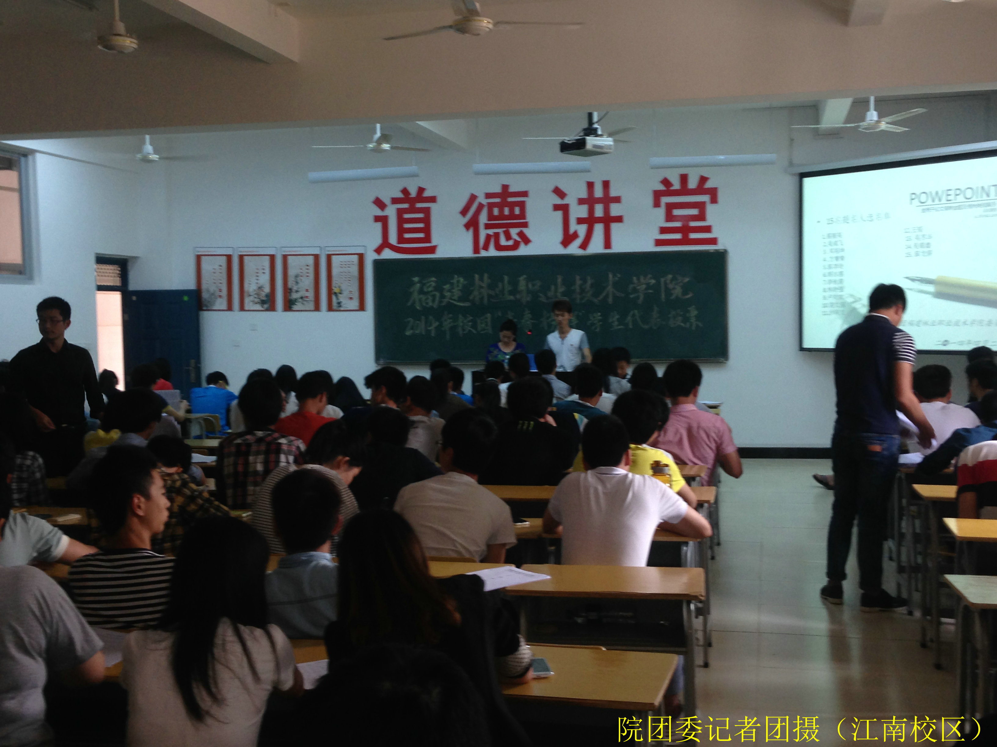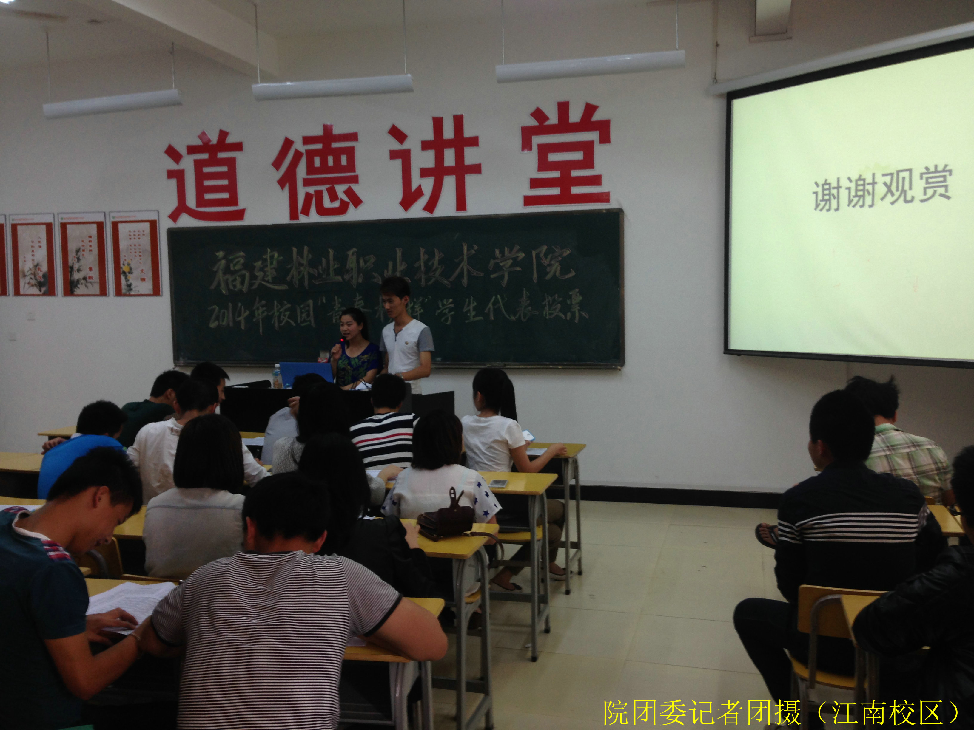 4月29日下午2:30分,在我院江南校区实训四310室组织召开福建林业职业技术学院2014年校园“青春榜样”学生代表评选会议。团委叶新颖老师、各系副部级以上学生干部、各班班长和团支部书记出席了本次评选会议,对15名“青春榜样”提名候选人进行投票。