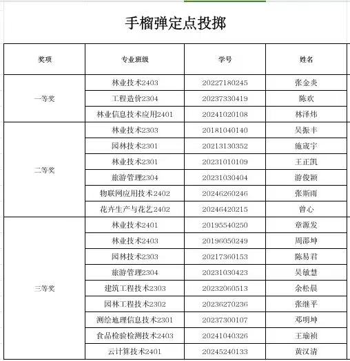 经过一天的激烈比拼,各项比赛项目圆满结束。参赛选手们以精湛的技能、顽强的意志和出色的表现,赢得了现场观众的阵阵掌声。最终,经过工作人员对分数的统计计算,大学生军事技能比武获奖名单正式揭晓: