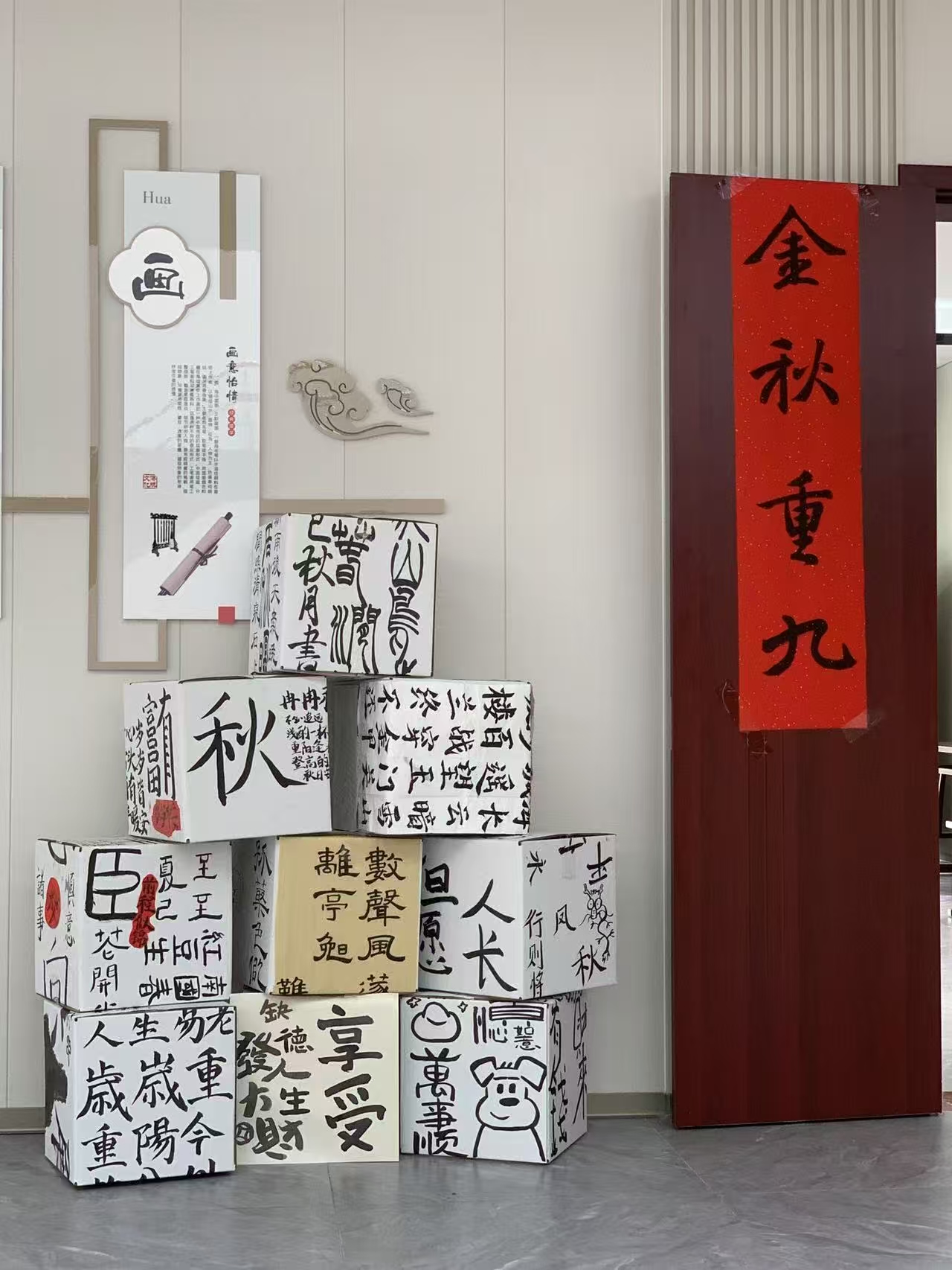 •纸箱堆成的诗行:白箱黑字里藏着“岁岁重阳”“秋风起”的笔意,连卡通小狗涂鸦都裹着墨香,随手倚着拍张照,国风氛围感便漫出了镜头;