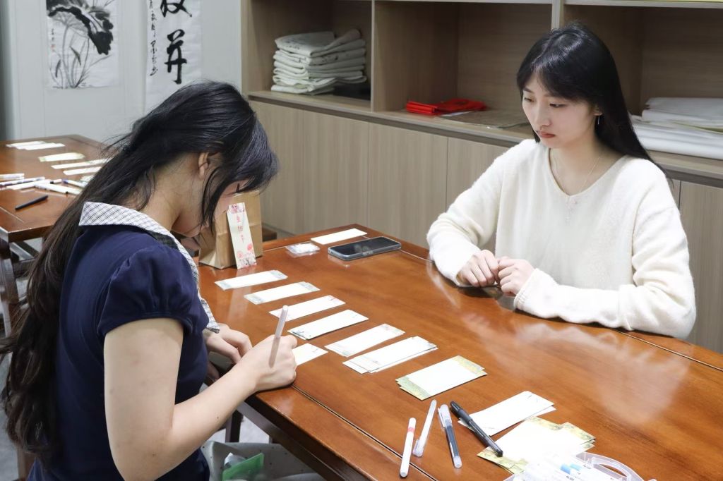 书画室里,墨香裹着笑语漫开——围在木桌旁的几人正陷在字谜的趣味里。刚有人念出“‘又逢一年重阳到’打一字”,执笔的女生指尖点着纸面笑:“是‘圣’!‘又’遇‘重阳(土)’,可不就是它?”旁边举着手机的同伴晃了晃屏幕,凑过来补新谜,连墙上的书法落款,都似浸了这热闹的暖意。