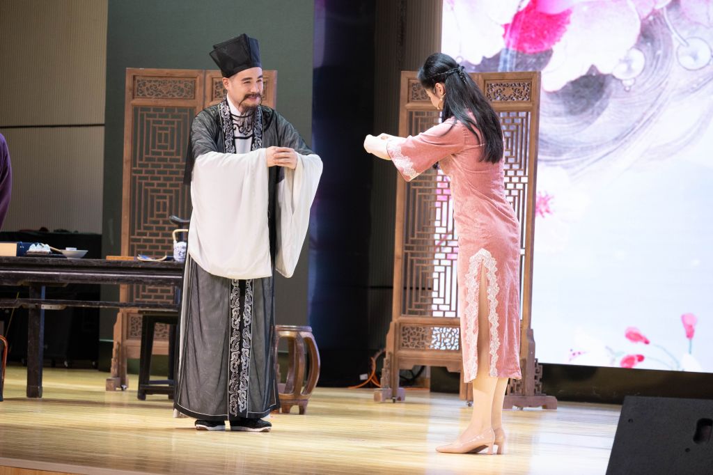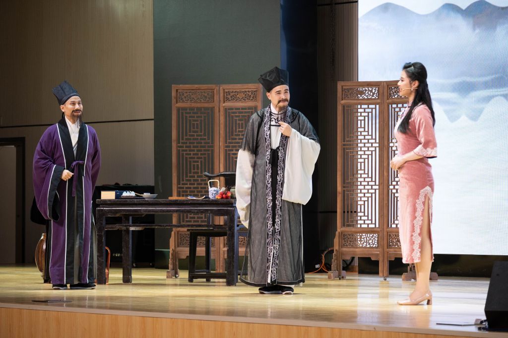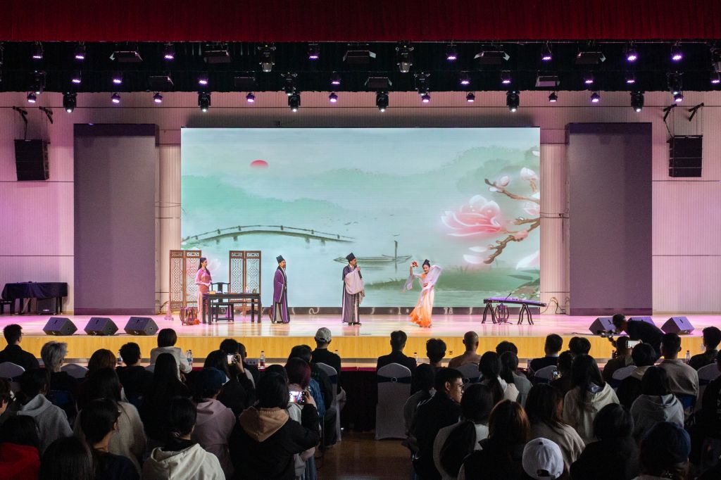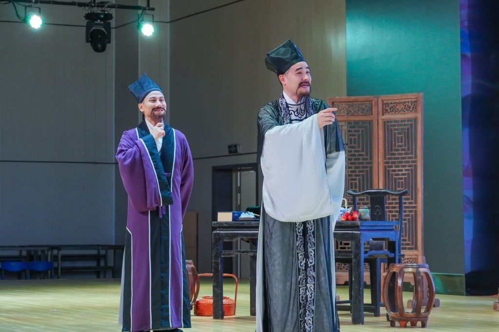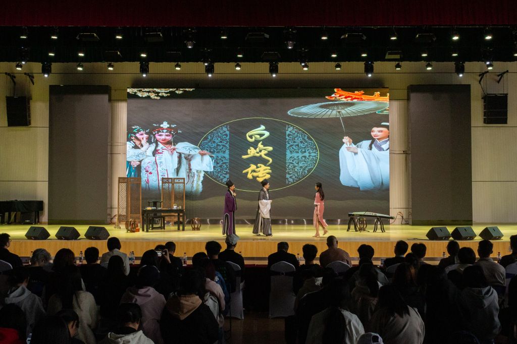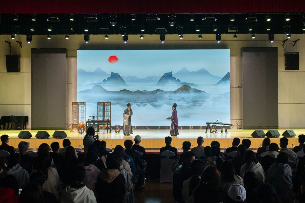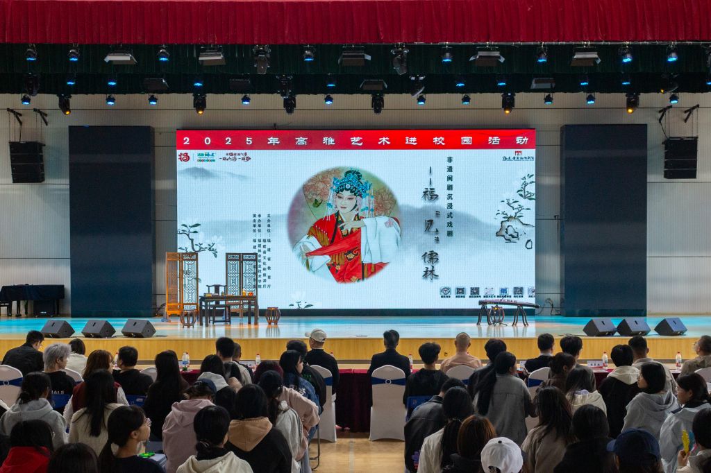《福“见”儒林》以闽剧始祖曹学佺与四百年后福建省实验闽剧院的一位年轻演员跨越时空的相遇为故事主线,以“古今对话”的方式,巧妙地将优美动人的中国古典舞蹈、时尚动感的流行音乐、悠扬悦耳的古筝演奏与传统闽剧折子戏《双蝶扇·忆双蝶》《荔枝换绛桃·投荔》以及《白蛇传》选段融汇贯通,精彩纷呈。非遗闽剧沉浸式戏剧《福“见”儒林》受到我院广大师生的热烈欢迎。