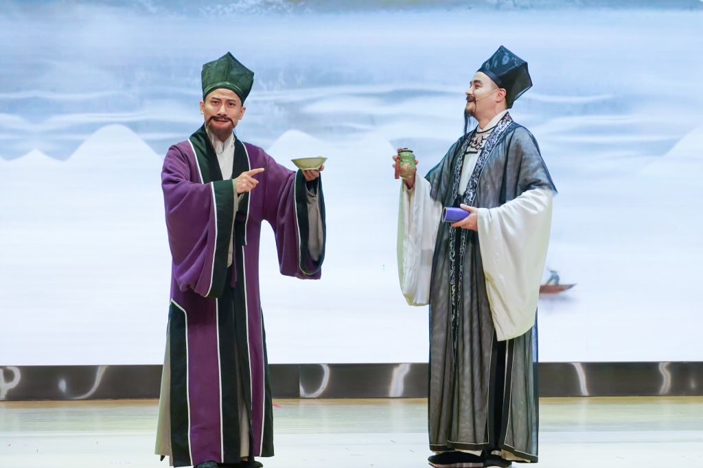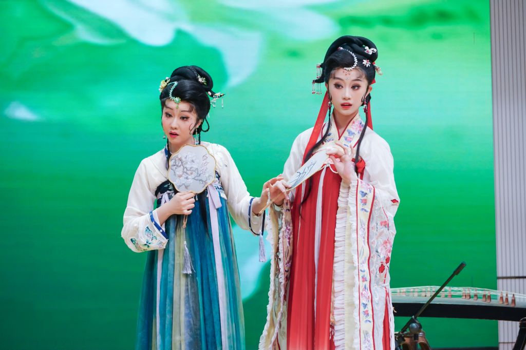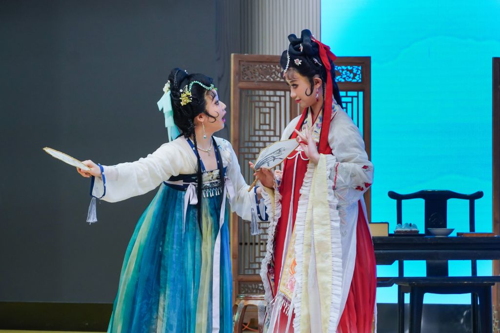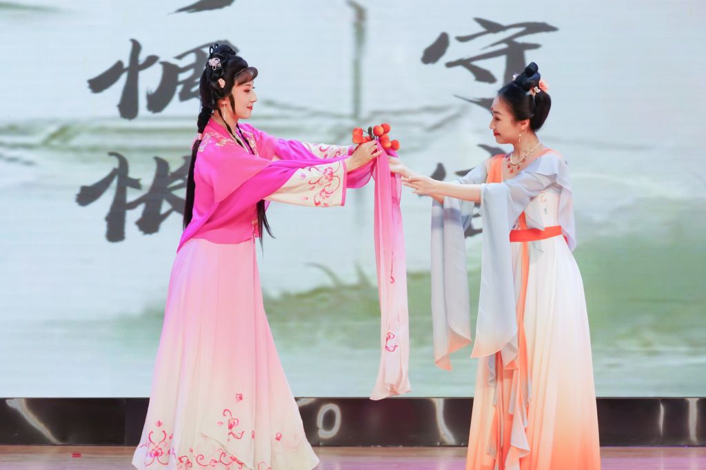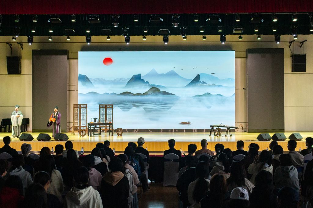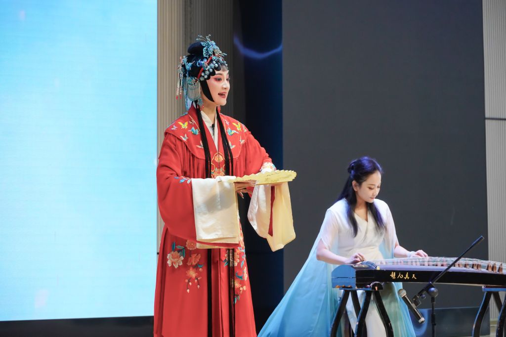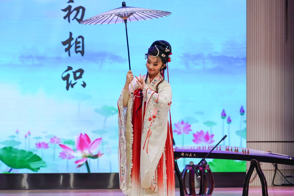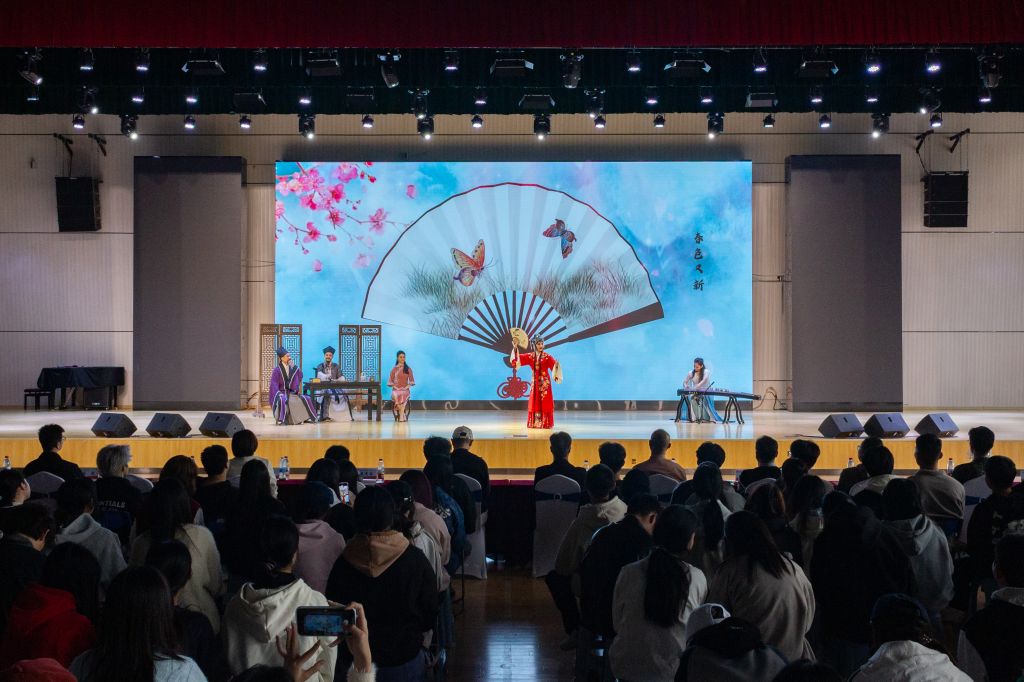 《福“见”儒林》以闽剧始祖曹学佺与四百年后福建省实验闽剧院的一位年轻演员跨越时空的相遇为故事主线,以“古今对话”的方式,巧妙地将优美动人的中国古典舞蹈、时尚动感的流行音乐、悠扬悦耳的古筝演奏与传统闽剧折子戏《双蝶扇·忆双蝶》《荔枝换绛桃·投荔》以及《白蛇传》选段融汇贯通,精彩纷呈。非遗闽剧沉浸式戏剧《福“见”儒林》受到我院广大师生的热烈欢迎。