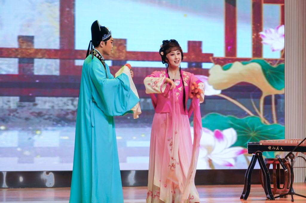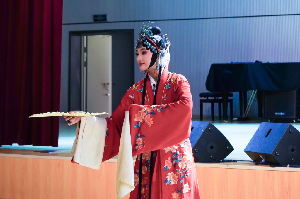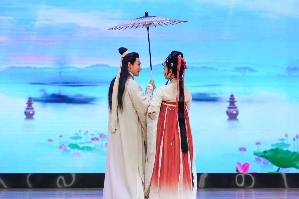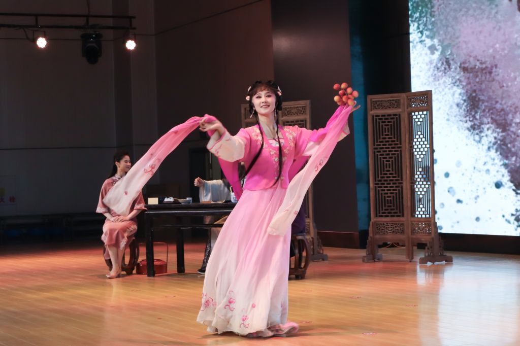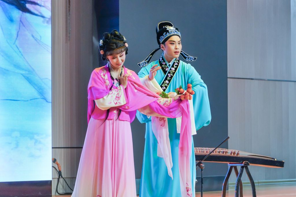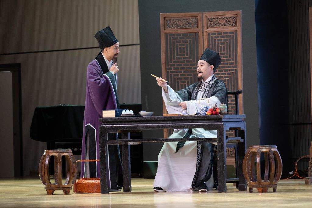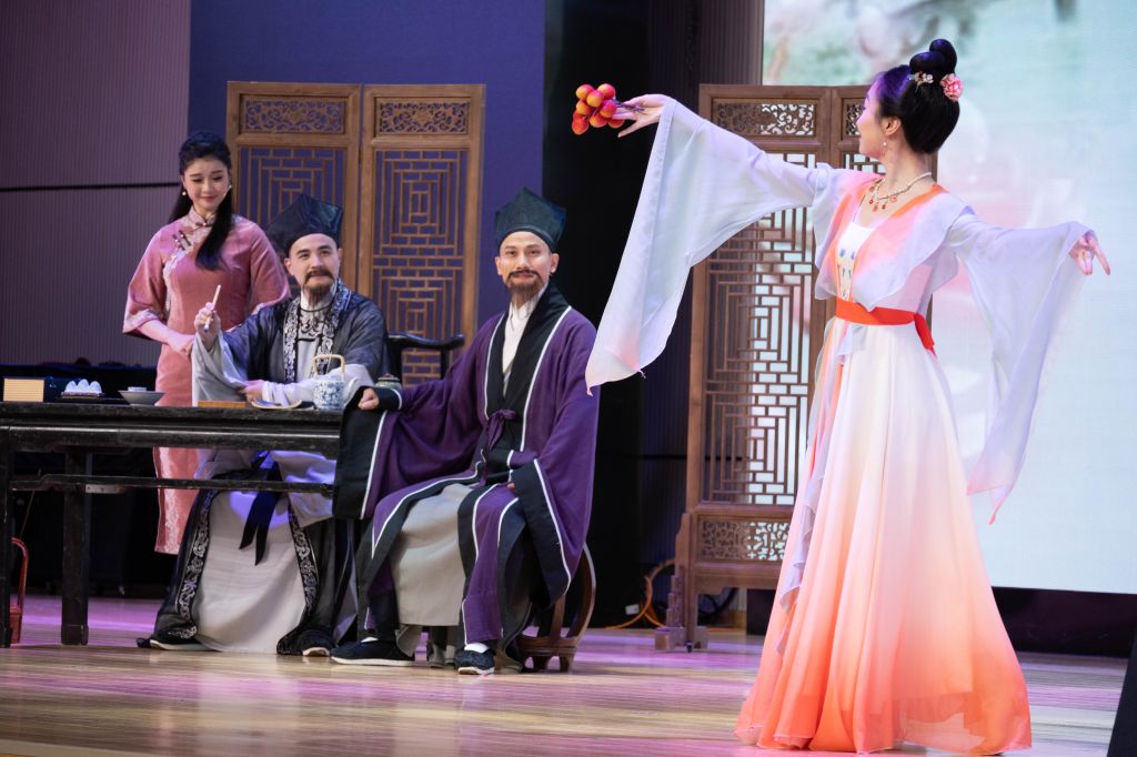 《福“见”儒林》以闽剧始祖曹学佺与四百年后福建省实验闽剧院的一位年轻演员跨越时空的相遇为故事主线,以“古今对话”的方式,巧妙地将优美动人的中国古典舞蹈、时尚动感的流行音乐、悠扬悦耳的古筝演奏与传统闽剧折子戏《双蝶扇·忆双蝶》《荔枝换绛桃·投荔》以及《白蛇传》选段融汇贯通,精彩纷呈。非遗闽剧沉浸式戏剧《福“见”儒林》受到我院广大师生的热烈欢迎。
