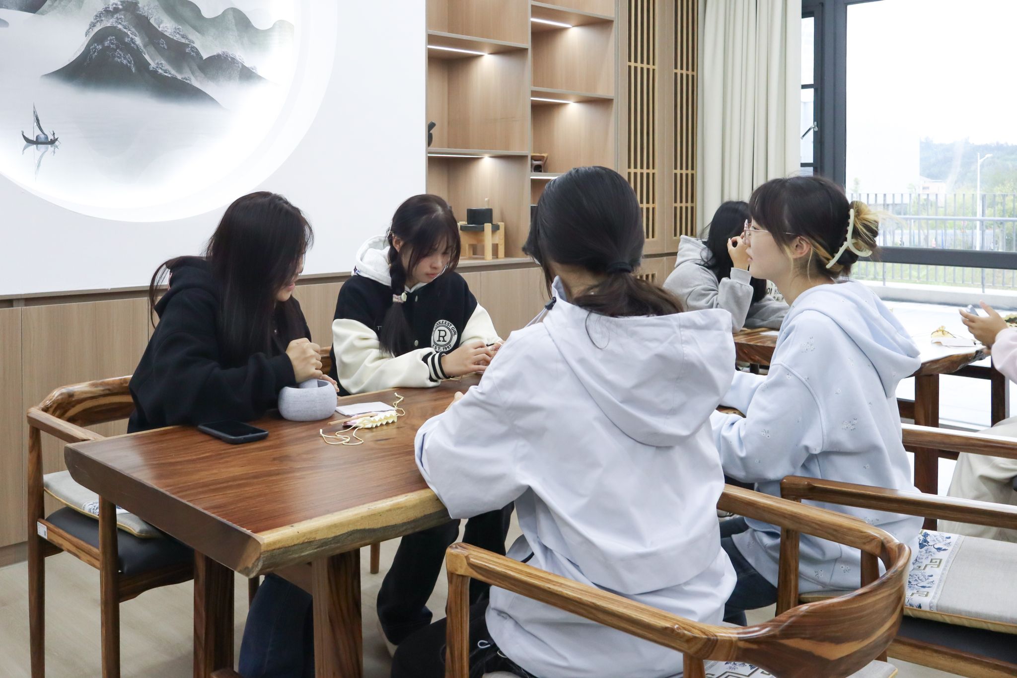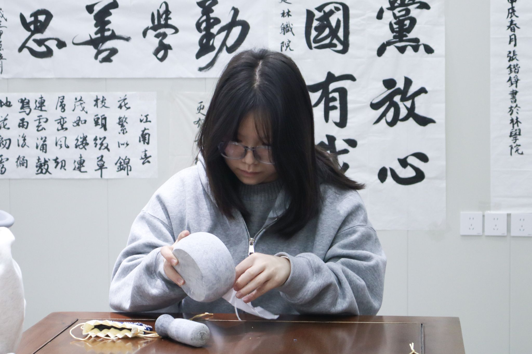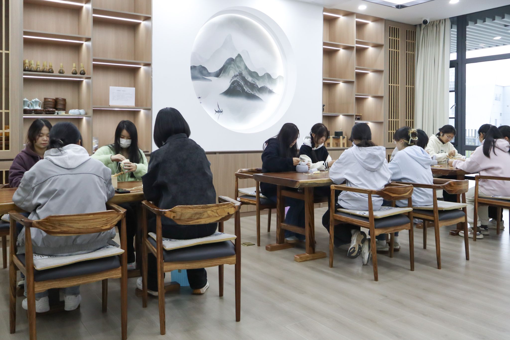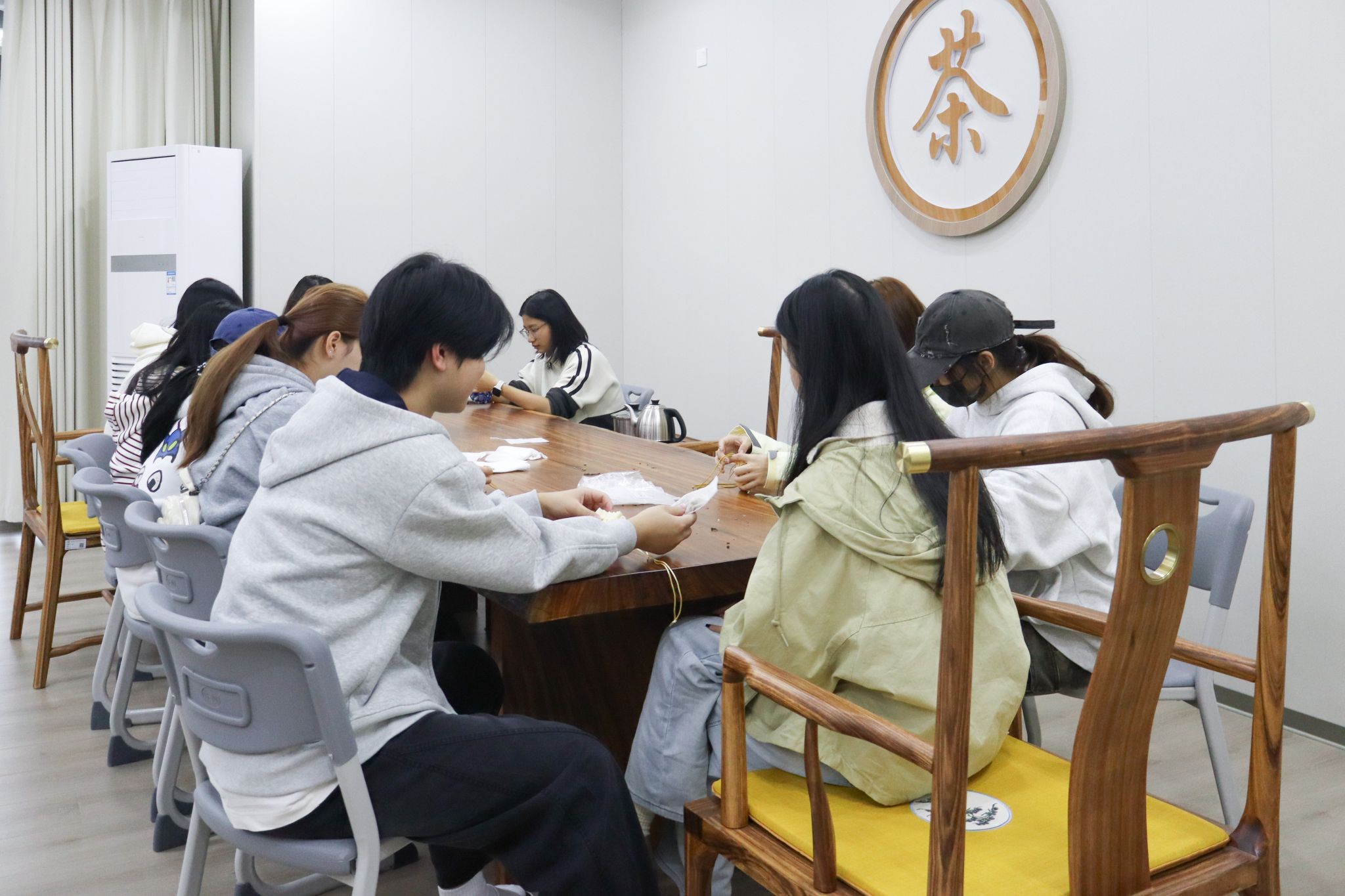 过程中,学子们也相互帮忙、交流技巧,没有电子设备的干扰,只有专注的眼神与指尖的温度,尽显“祈福敬长,绣制香包,传承雅韵”的活动初心。