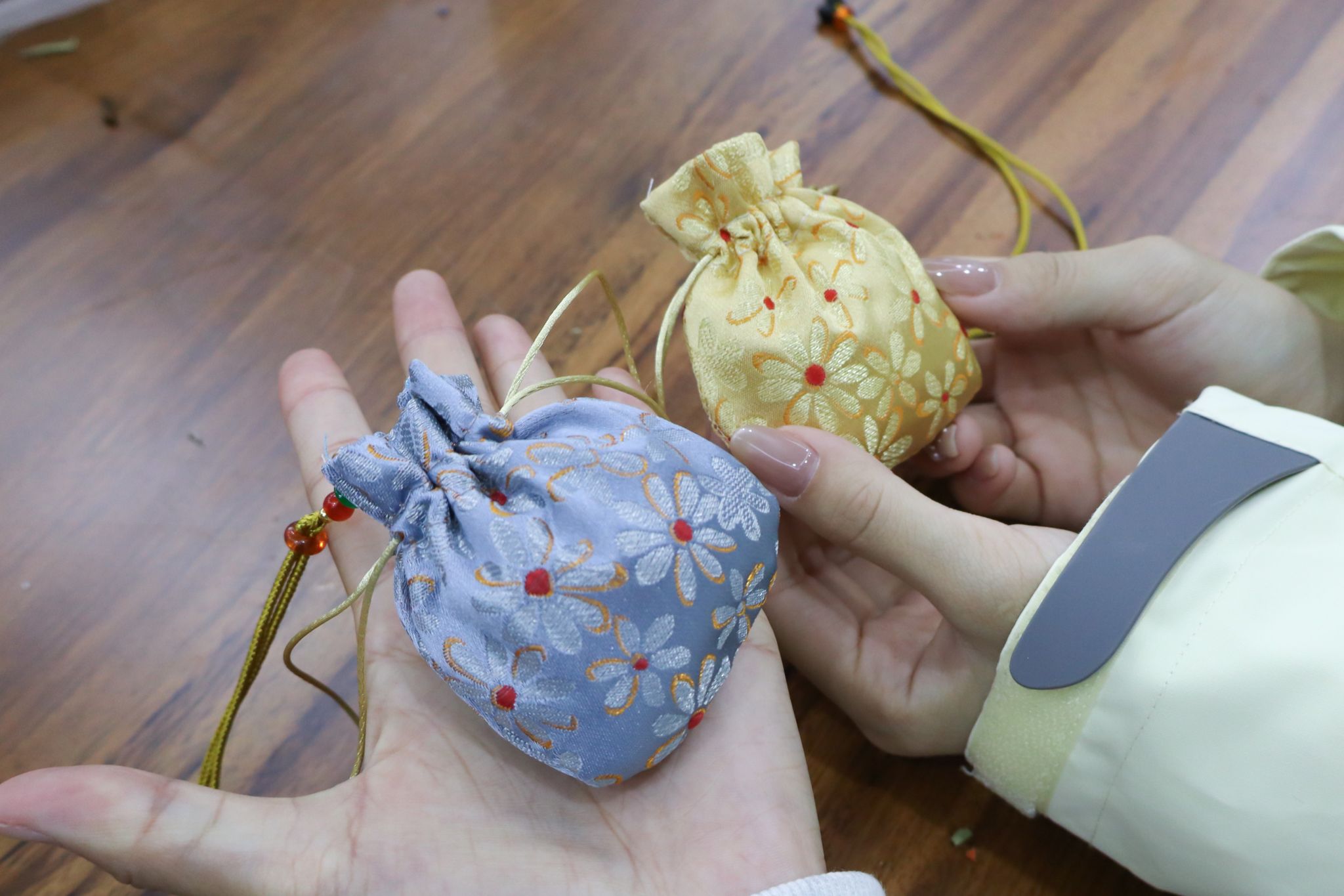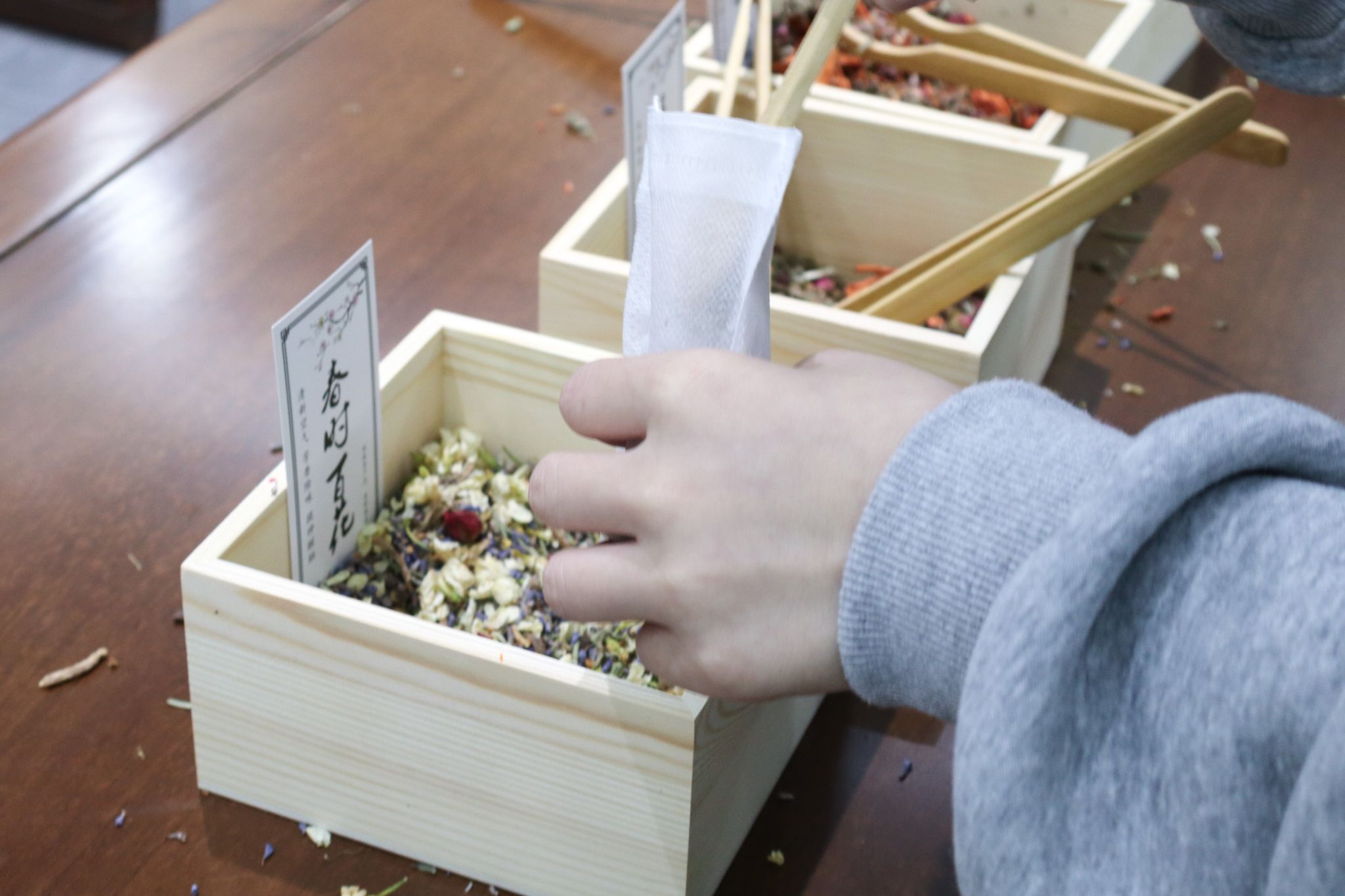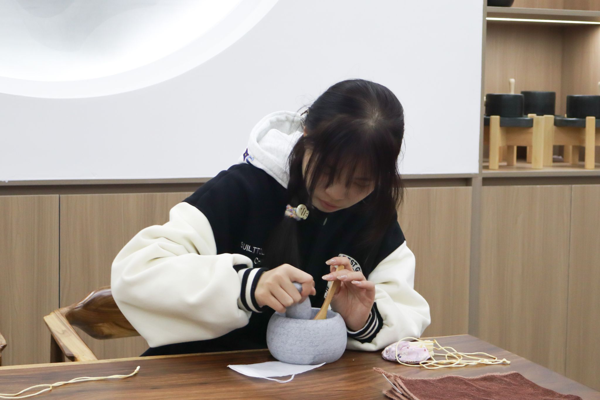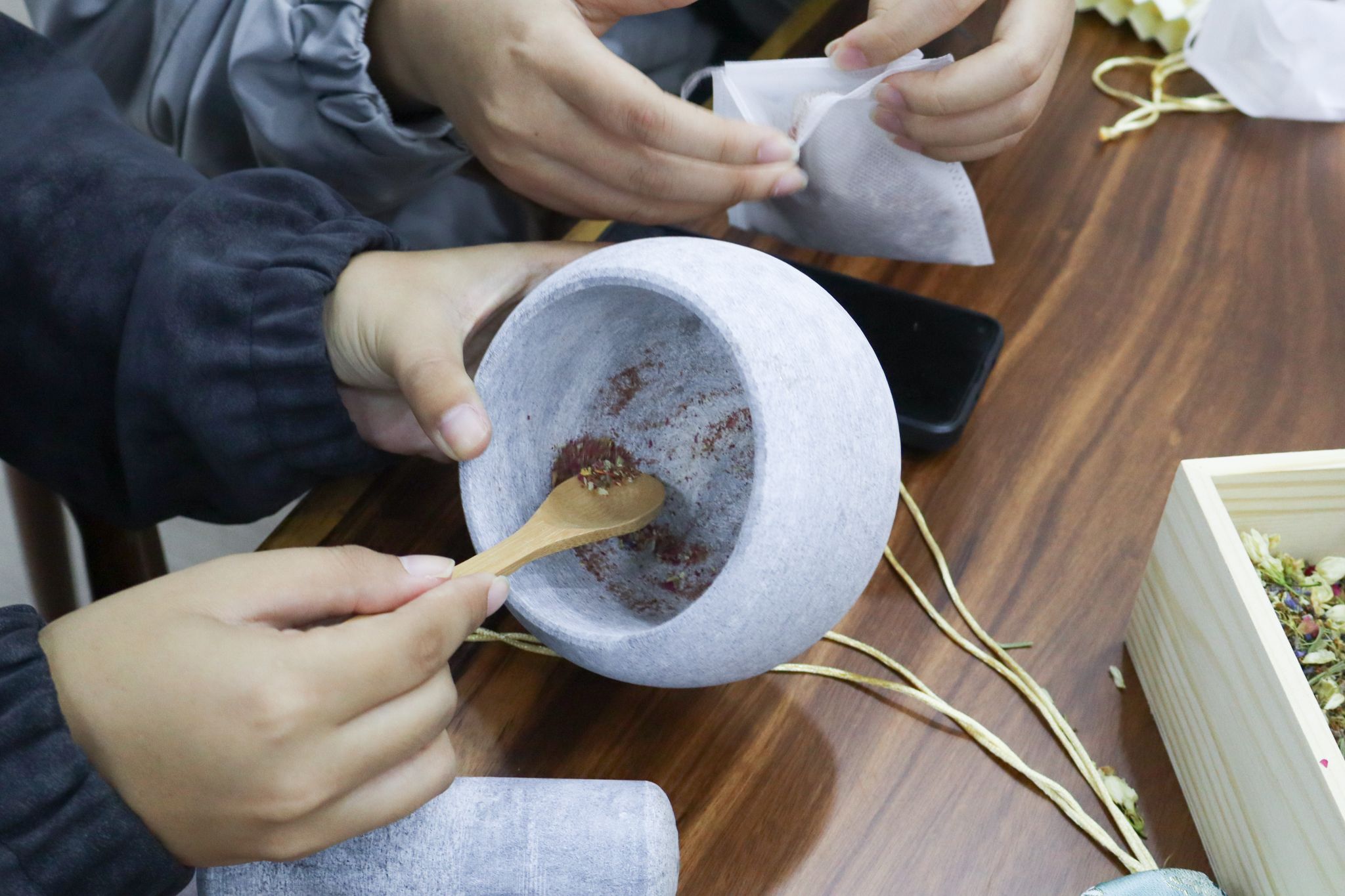 大家有序签到后,便沉浸在香包制作的乐趣中:挑选心仪的香囊空袋,用木勺舀取喜爱的香料组合,仔细调配专属香方,将对生活的期许、对强国的向往,都藏进小小的香囊里。