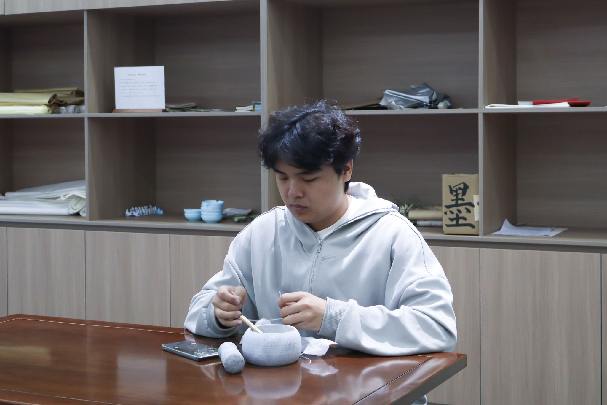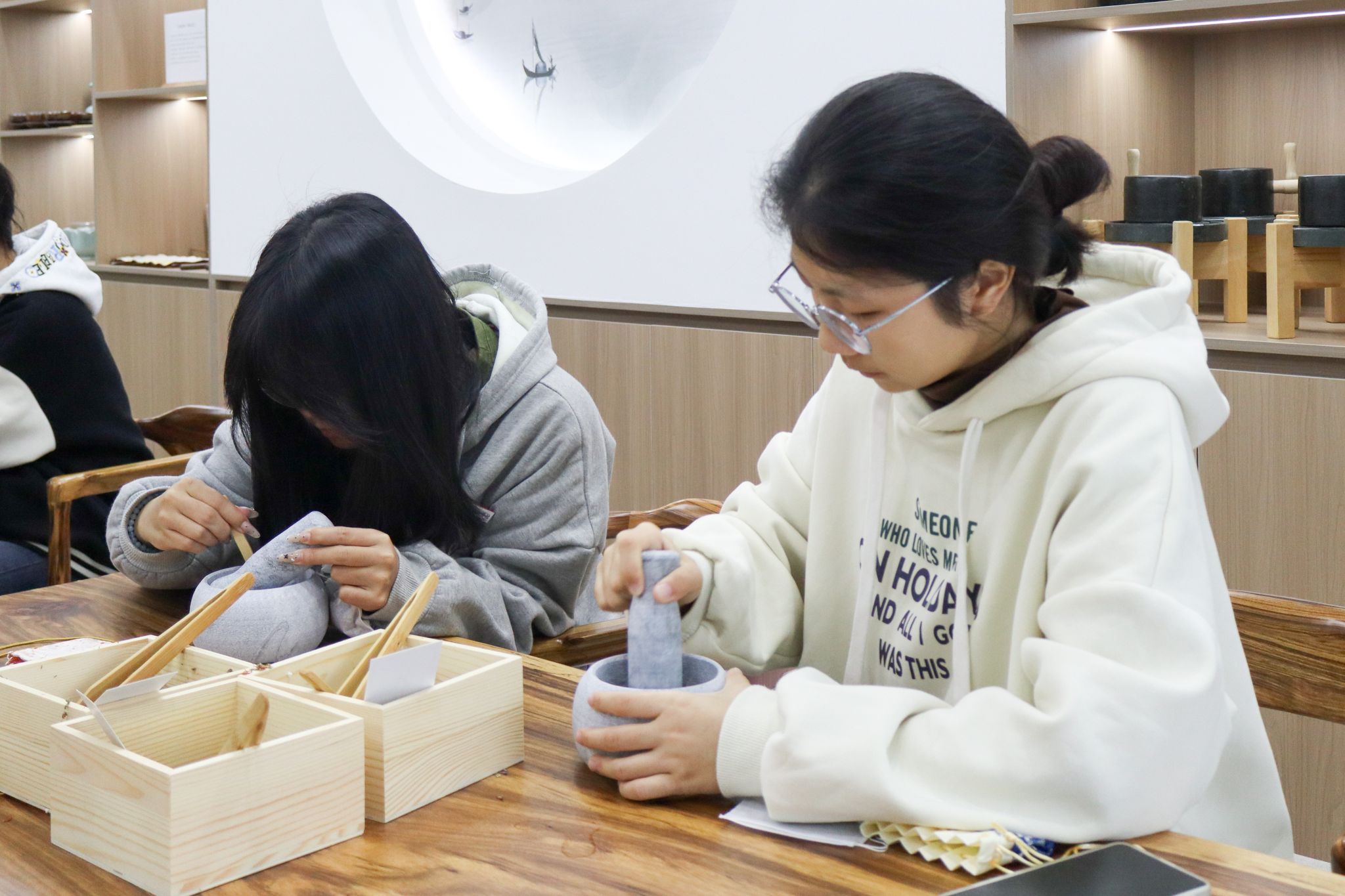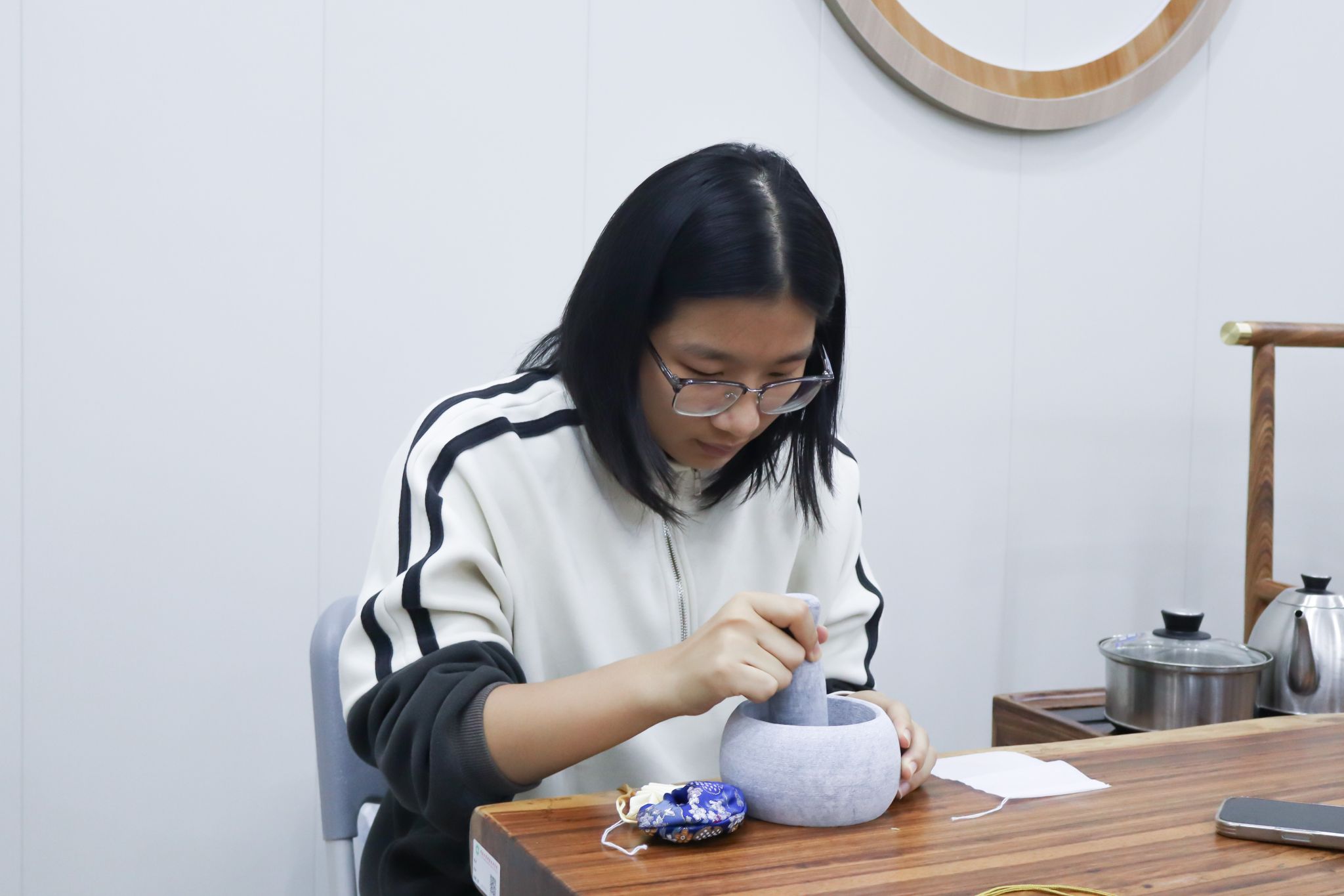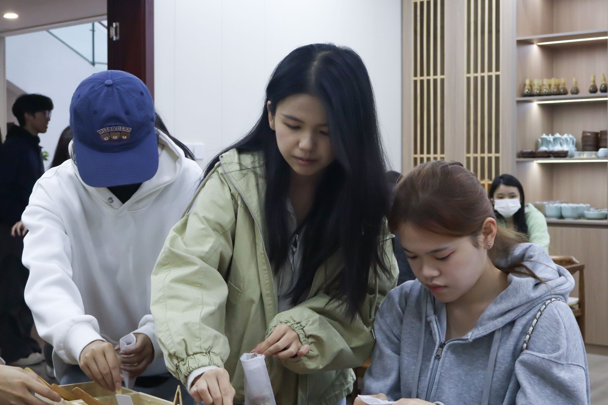 大家有序签到后,便沉浸在香包制作的乐趣中:挑选心仪的香囊空袋,用木勺舀取喜爱的香料组合,仔细调配专属香方,将对生活的期许、对强国的向往,都藏进小小的香囊里。