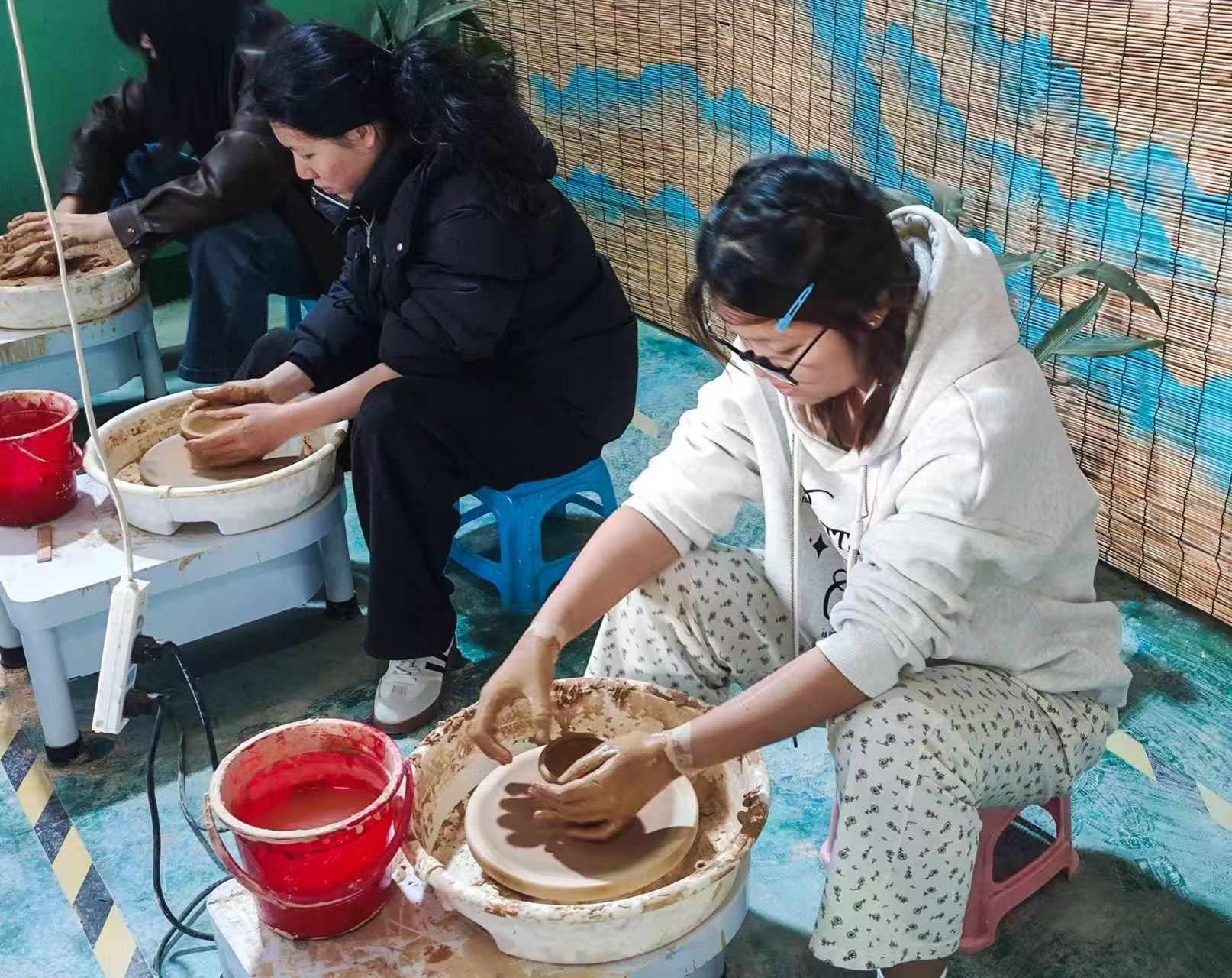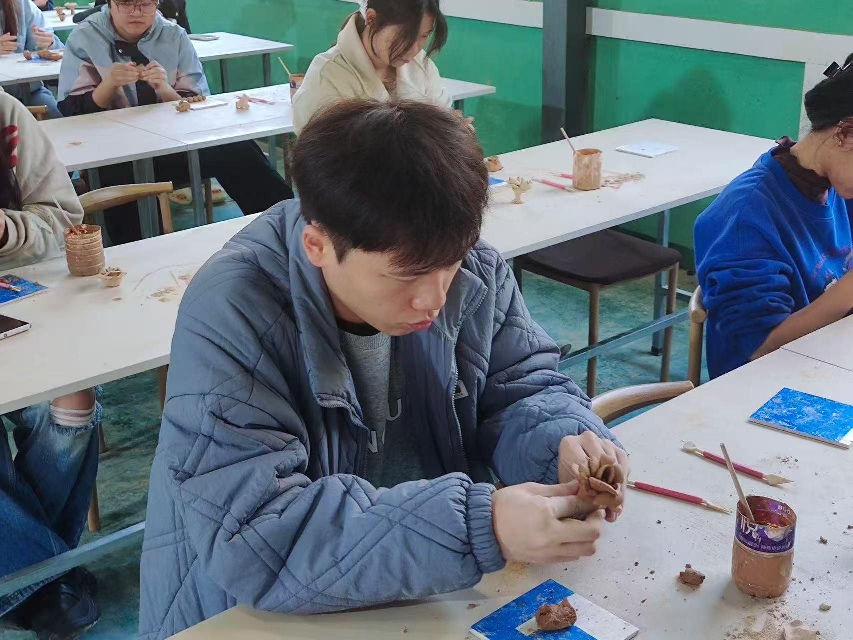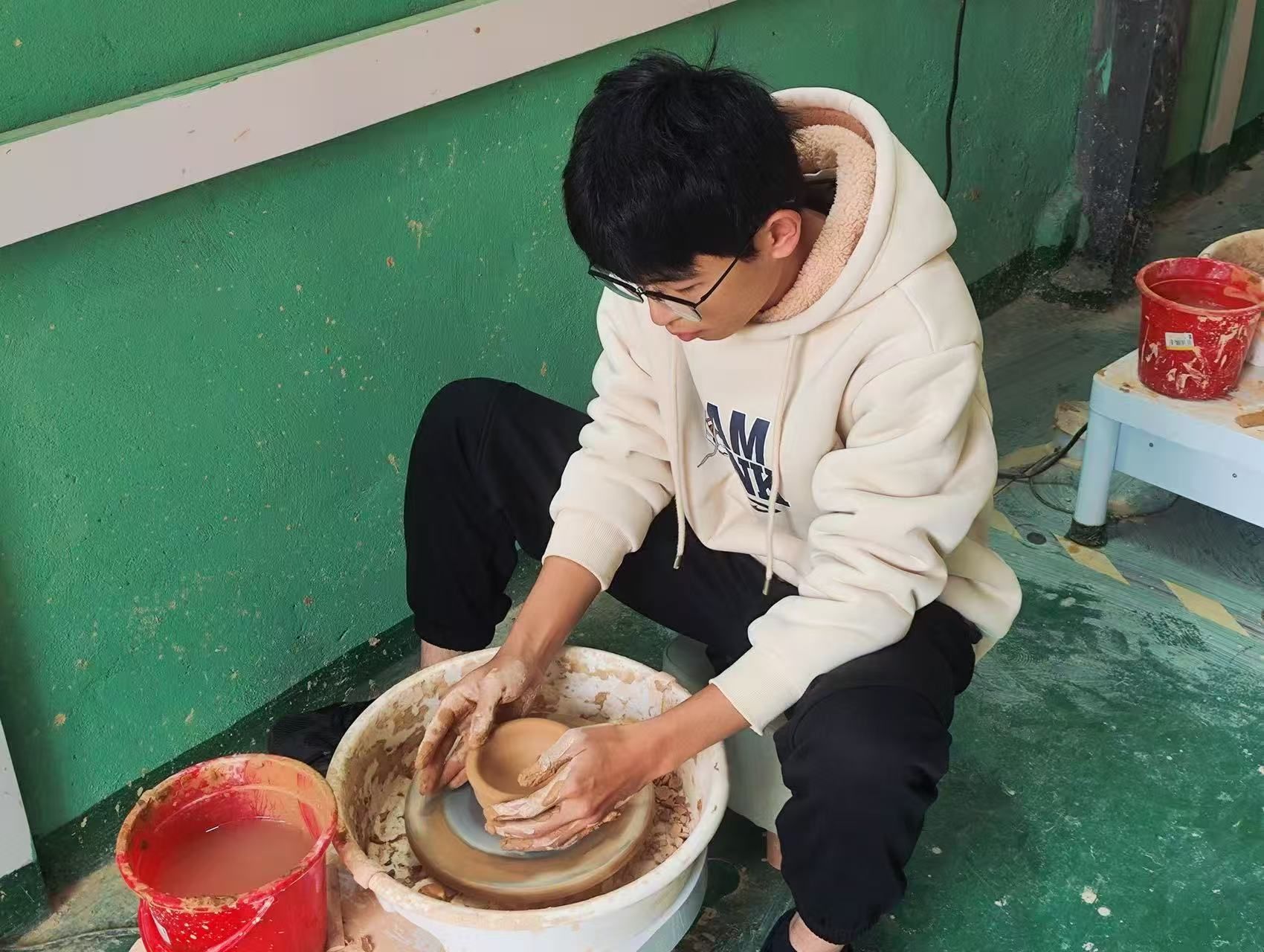同学们围在拉坯机旁,从一开始的手忙脚乱,到慢慢找到节奏。有人捏出了小巧的茶杯,有人尝试了别致的茶盏,哪怕是歪歪扭扭的“半成品”,也藏着独属于自己的心意。沾满陶土的双手,是与非遗最亲密的接触;阳光下晾晒的陶坯,是青春与传统碰撞的印记。